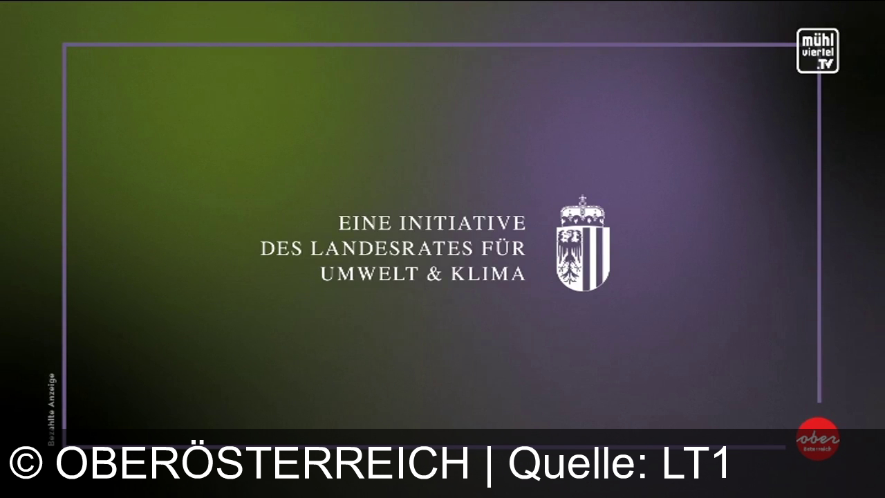 Einfarbiger Hintergrund im Farbverlauf von Grün zu Lila. In der Mitte steht "EINE INITIATIVE DES LANDESRATES FÜR UMWELT & KLIMA" neben einem Wappen. Rechts unten ist das rote Logo von Oberösterreich, links oben steht "mühlviertel TV". Links unten ist klein "Bezahlte Anzeige" zu lesen.