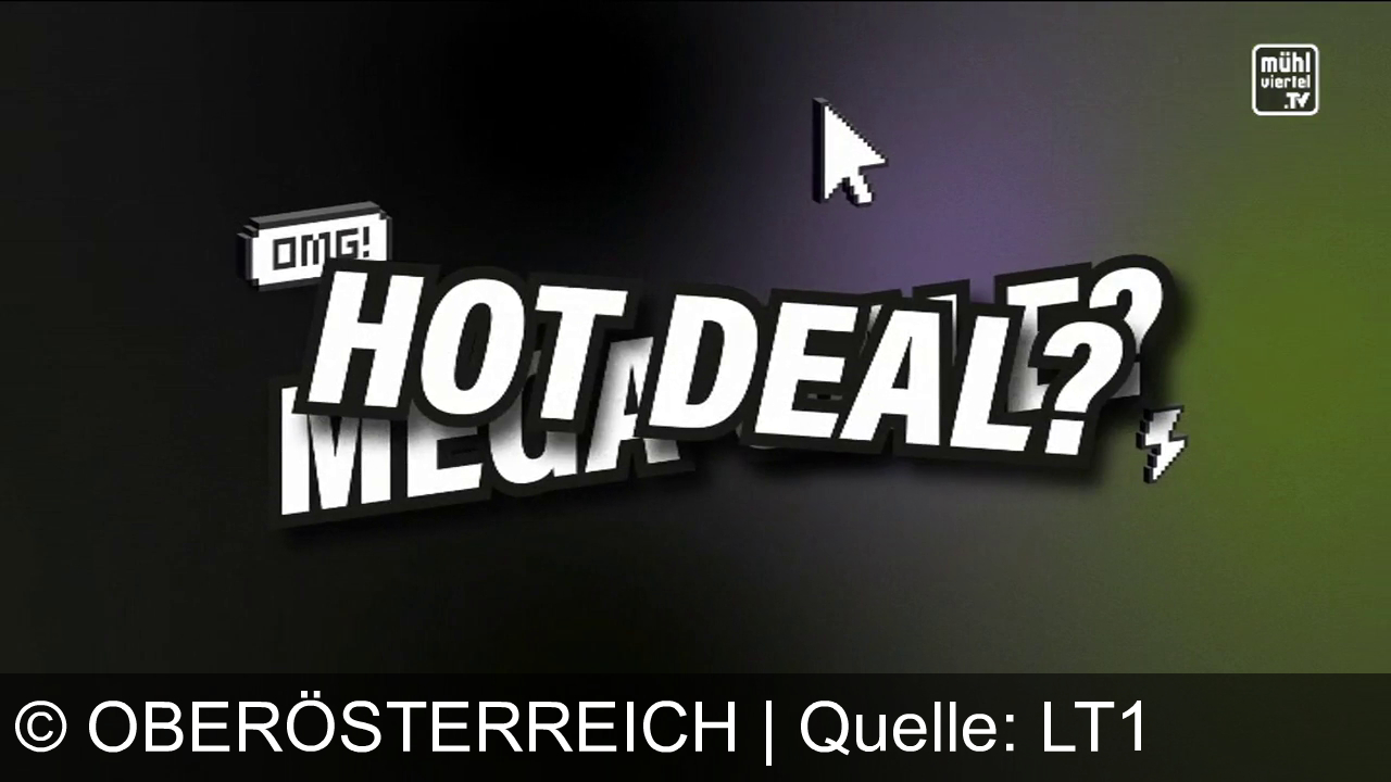 Großer, weißer Text mit "OMG! MEGA HOT DEAL?" auf einem dunklen, farbverlaufenden Hintergrund. Ein weißer Mauszeiger ist oben mittig sichtbar. Oben rechts steht "mühlviertel TV" in einem kleinen rechteckigen Rahmen. Blitz-Symbol am unteren rechten Rand.