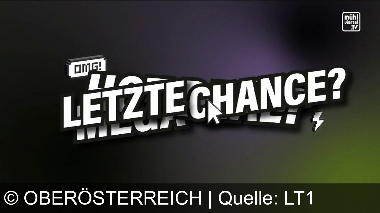Ein schwarzer Hintergrund mit einem großen weißen Schriftzug "LETZTE CHANCE?" in der Mitte. Links oben steht klein "OMG!". Oben rechts ist das Logo von "mühlviertel TV". Ein weißer Mauszeiger zeigt auf den Buchstaben "C".