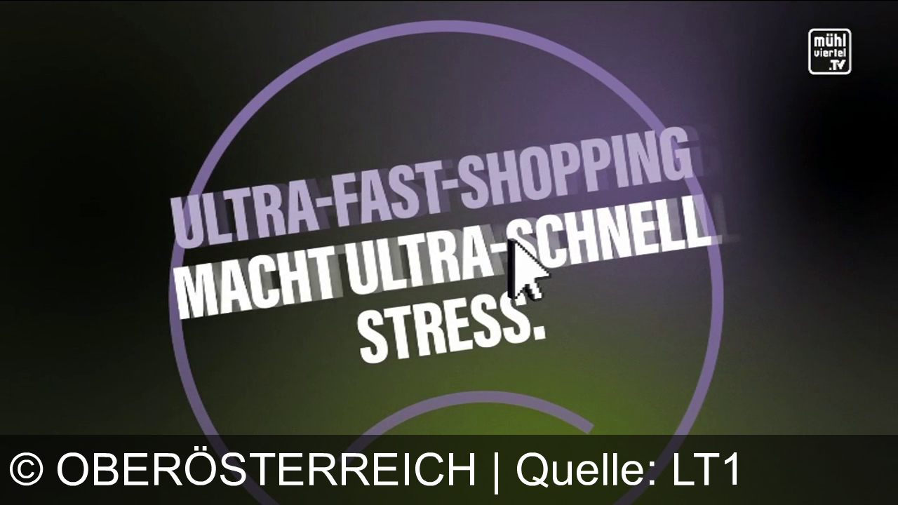 Ein schwarzer Hintergrund mit einem lila Kreis und einem Smiley, der ein unglückliches Gesicht darstellt. Der Text in der Mitte sagt: "ULTRA-FAST-SHOPPING MACHT ULTRA-SCHNELL STRESS." Eine große Mauszeiger-Hand ist auf den Text gerichtet. Oben rechts ist das Logo von "mühlviertel TV".