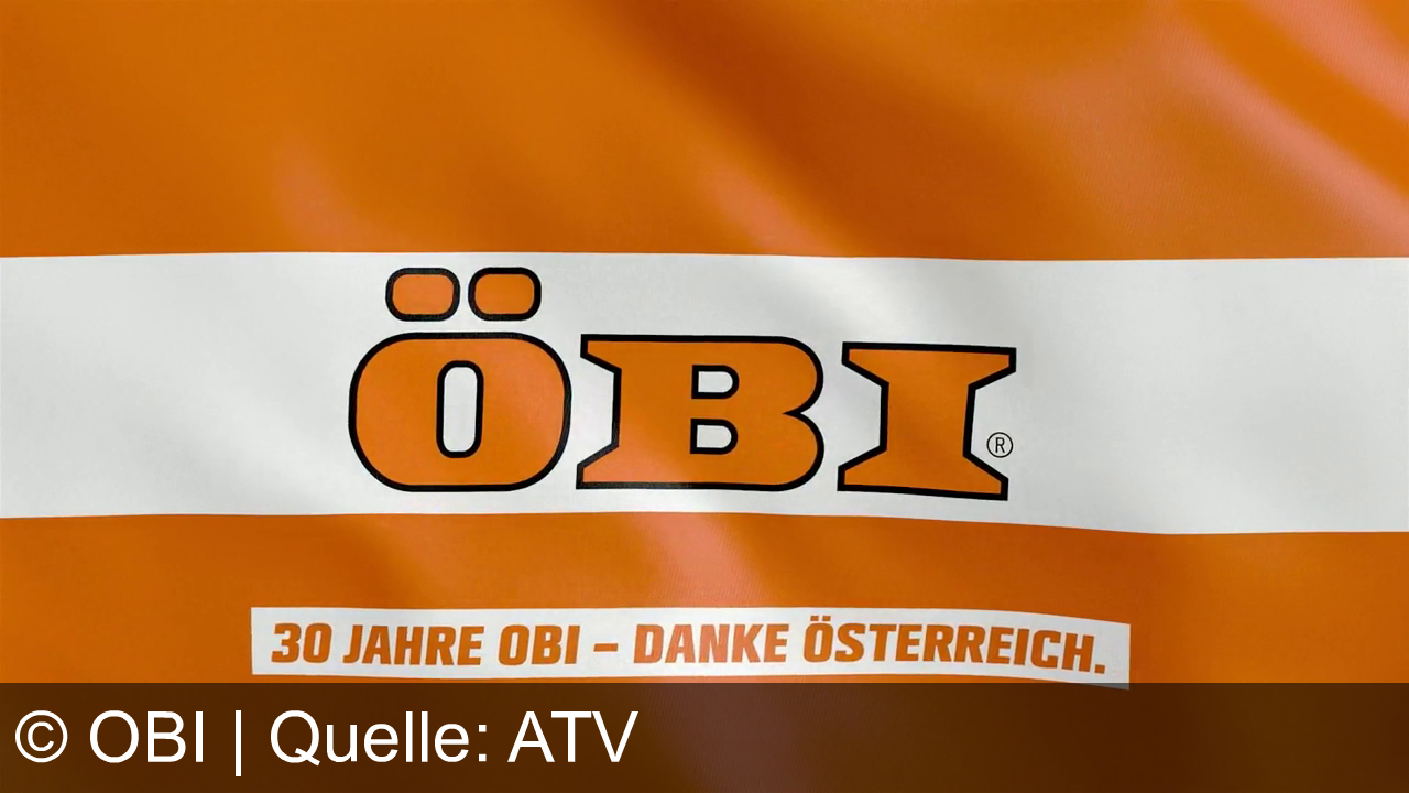 Ein orange-weißes Banner mit dem Schriftzug "OBI" in der Mitte. Darunter steht "30 Jahre OBI – Danke Österreich".