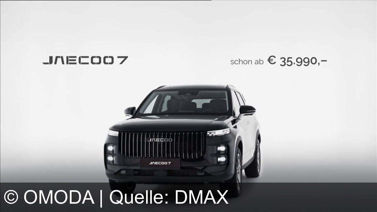 Ein schwarzes Auto, Modellname "JAECOO 7", steht vor einem grauen Hintergrund. Preisangabe rechts: "schon ab € 35.990,-".