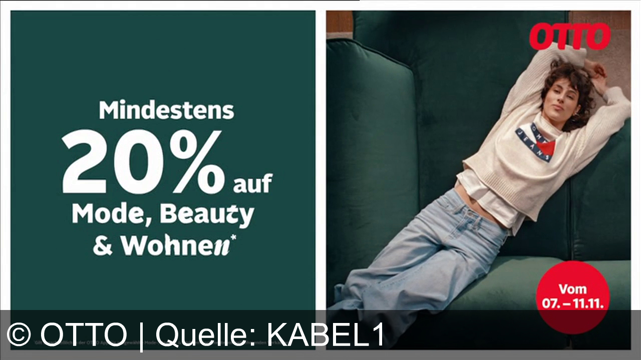 Links ein grünes Werbebanner mit "Mindestens 20% auf Mode, Beauty & Wohnen". Rechts eine Person in blauer Jeans und weißem Pullover auf einem grünen Sofa. Oben rechts rotes Logo "OTTO" und ein roter Kreis mit den Daten "07. – 11.11."