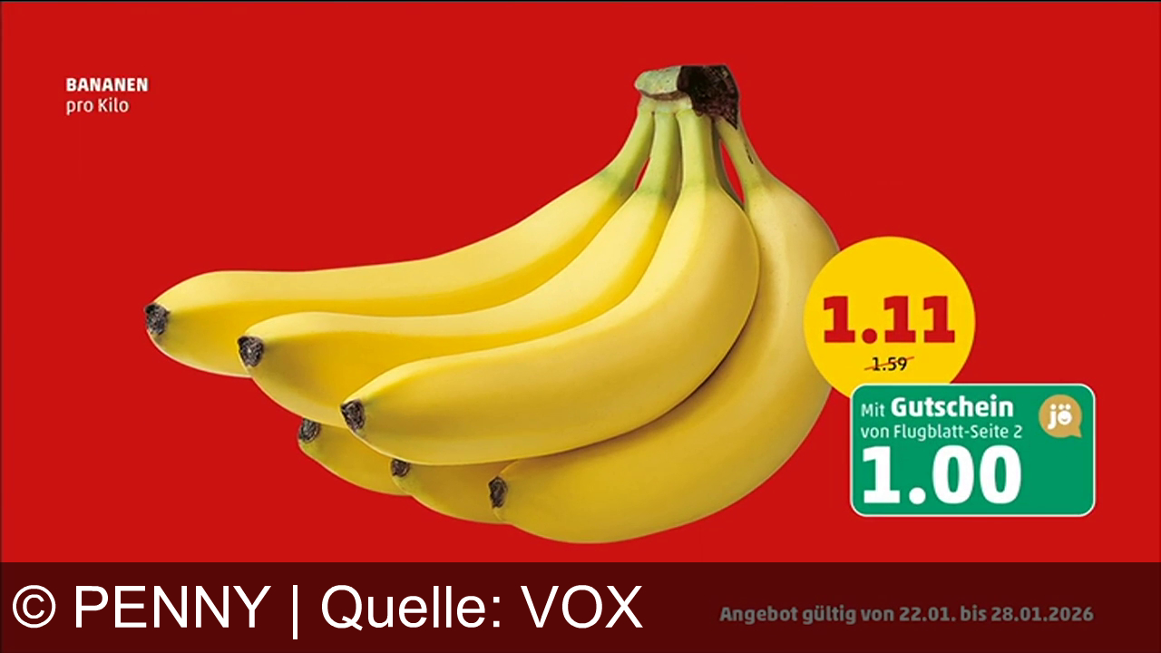 Werbung aus dem Jahr 2026 von Penny in Österreich, mit dem von uns gewählten Titel: "Bananen bei PENNY: Mit Gutschein nur 1 €/kg – dauerhaft super günstig einkaufen" mit der Kurzbeschreibung: "PENNY – Da schau her: Jetzt Bananen 30% günstiger, mit Gutschein aus dem Flugblatt sogar nur 1 €/kg. Immer super günstig bei PENNY!". Diese Werbung thematisiert oder beinhaltet die Kategorien Obst & Gemüse, Supermarkt, Lebensmittel, Rabatt.