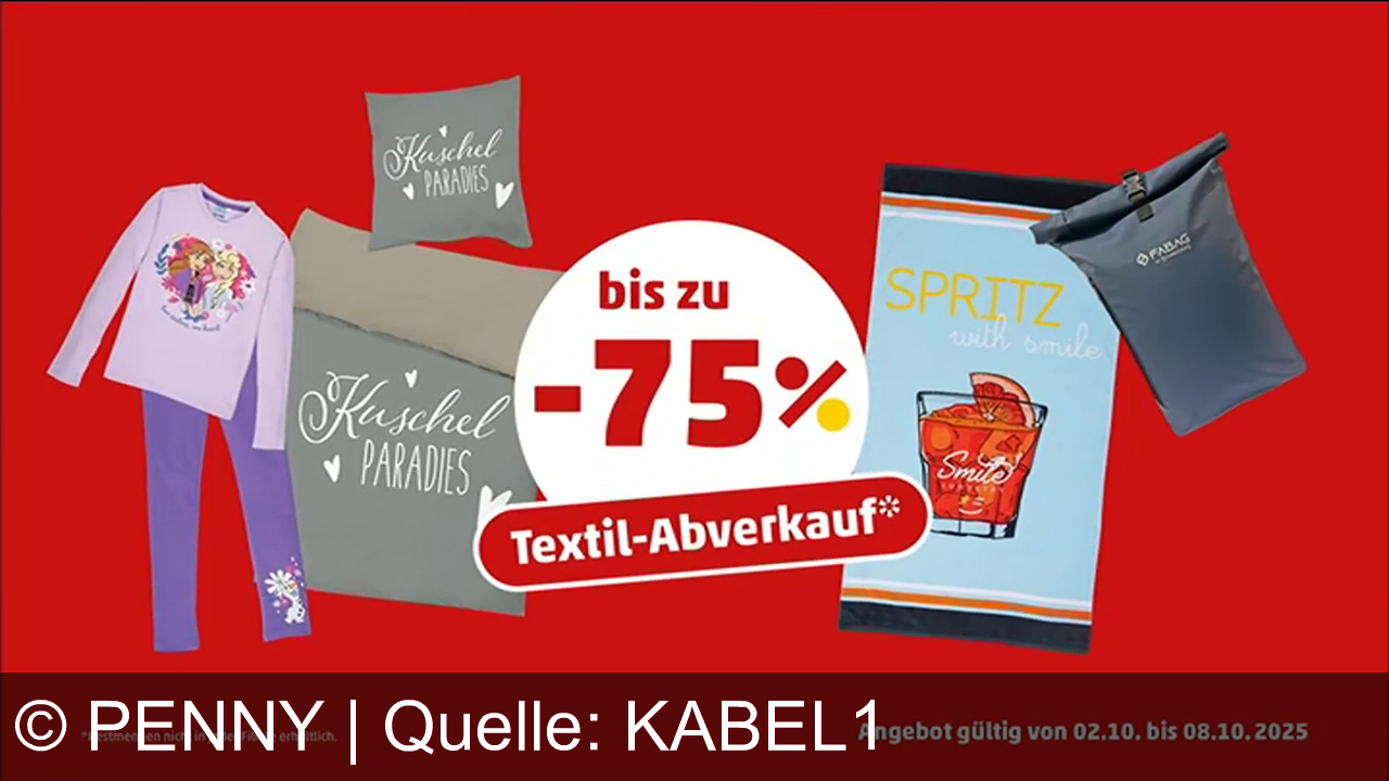 Penny wirbt mit einem großen Textil-Abverkauf und bietet bis zu 75% Rabatt auf Kleidung, Bettwäsche, Taschen und weitere Textilprodukte. Die Kernbotschaft: hochwertige Textilwaren gibt es für kurze Zeit besonders günstig bei Penny – „Immer super günstig! Penny, da schau her.“