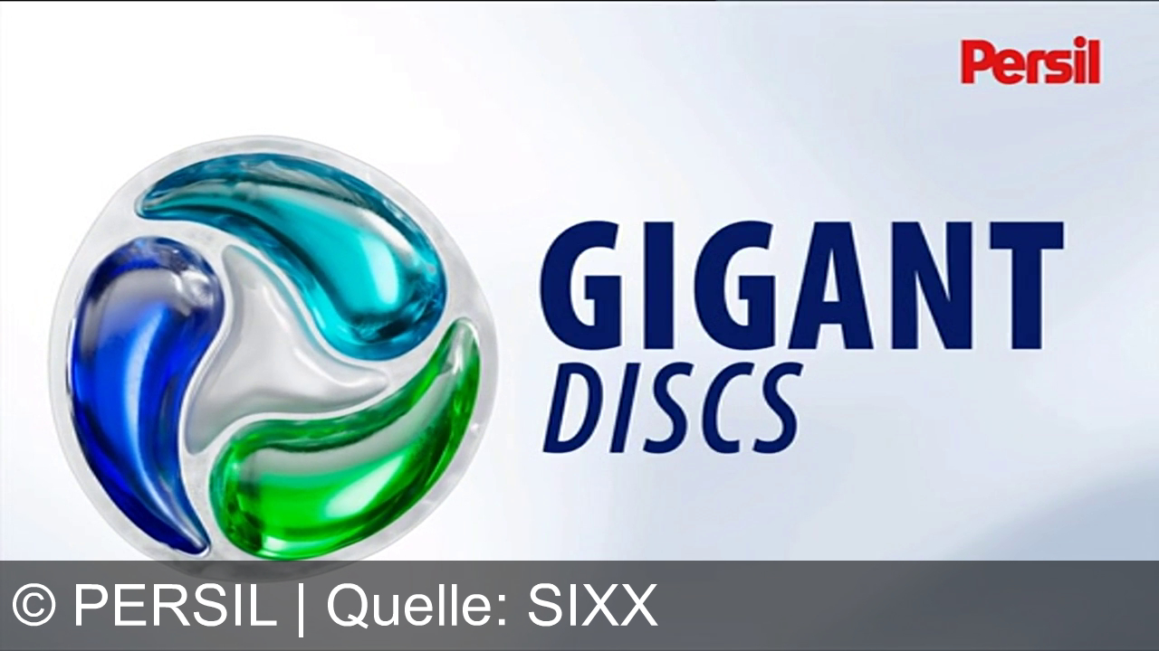 Großer, farbiger Waschmittel-Pod mit den Farben Blau, Grün und Weiß. Rechts daneben der Schriftzug "GIGANT DISCS" in blauer Schrift. Oben rechts das Persil-Logo in Rot. Hintergrund ist weißlich.