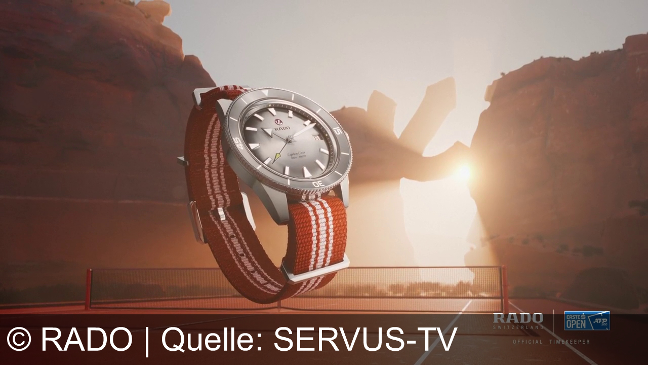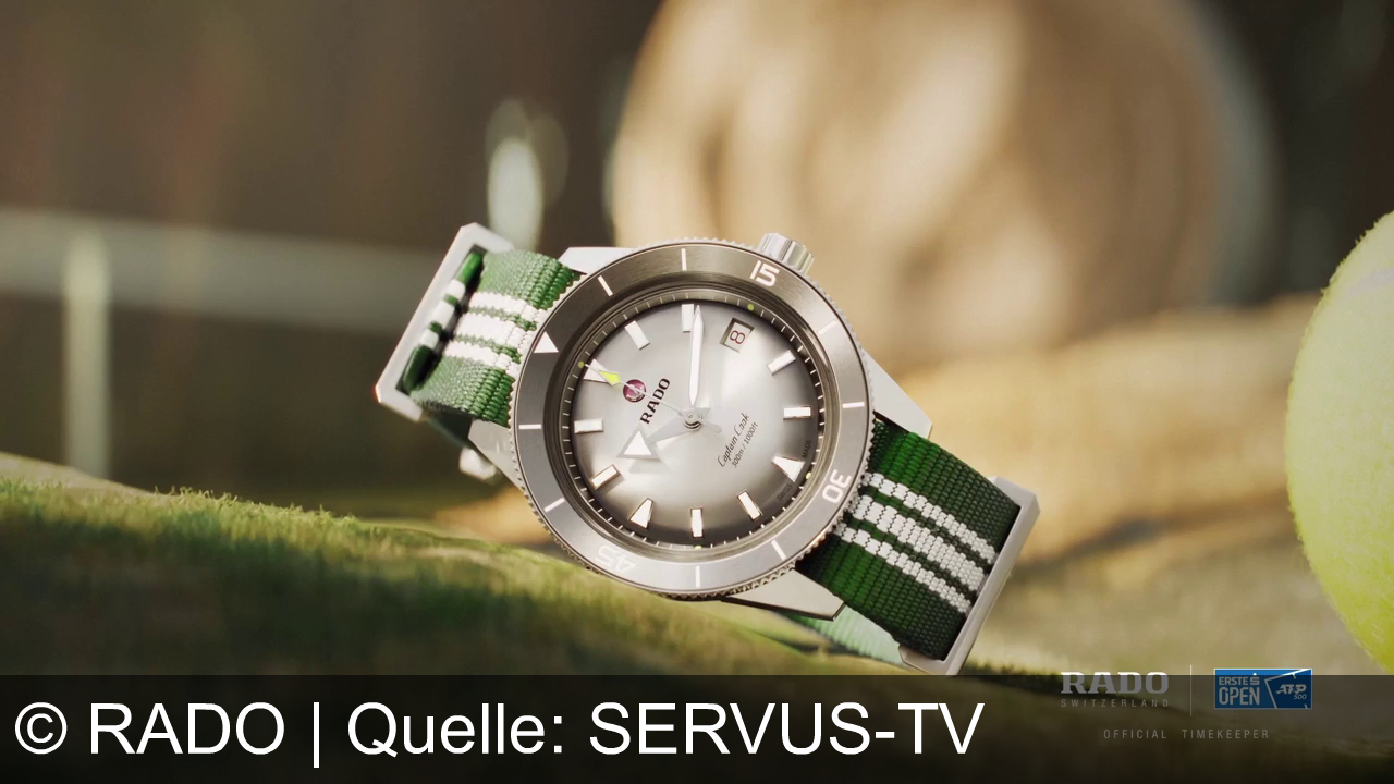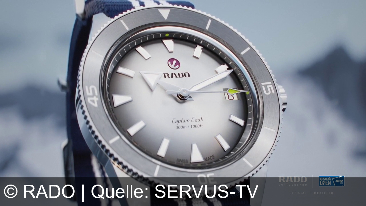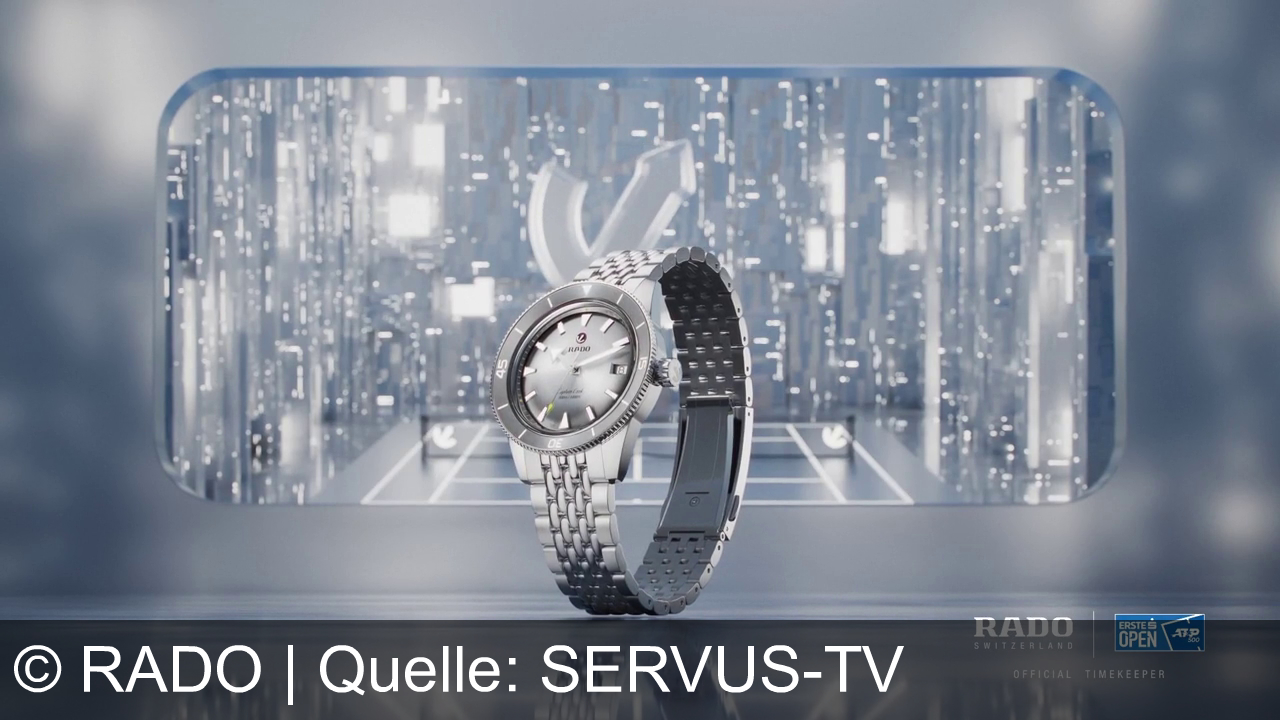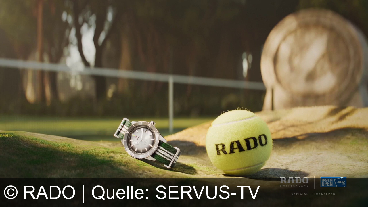 Werbung aus dem Jahr 2025 von Rado in Österreich, mit dem von uns gewählten Titel: "Rado Captain Cook: Eleganz und Präzision als offizieller Zeitnehmer der Erste Open ATP 500" mit der Kurzbeschreibung: "RADO – Offizieller Timekeeper des ATP Switzerland 500. Genieße Präzision und Stil auf dem Tennisplatz. Präsentiert mit Los Conquistadores und der Singapore International Foundation.". Diese Werbung thematisiert oder beinhaltet die Kategorien Uhren, Tennis.