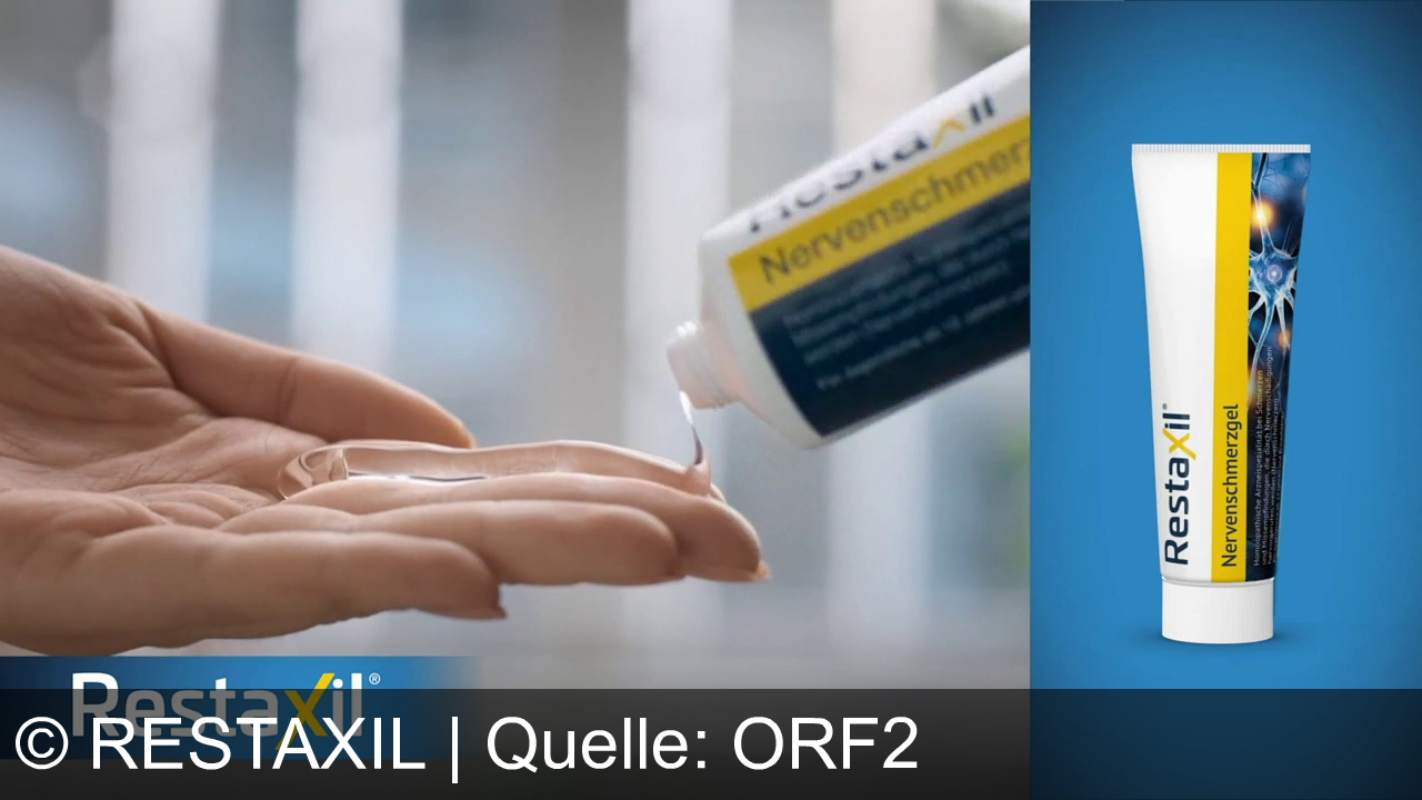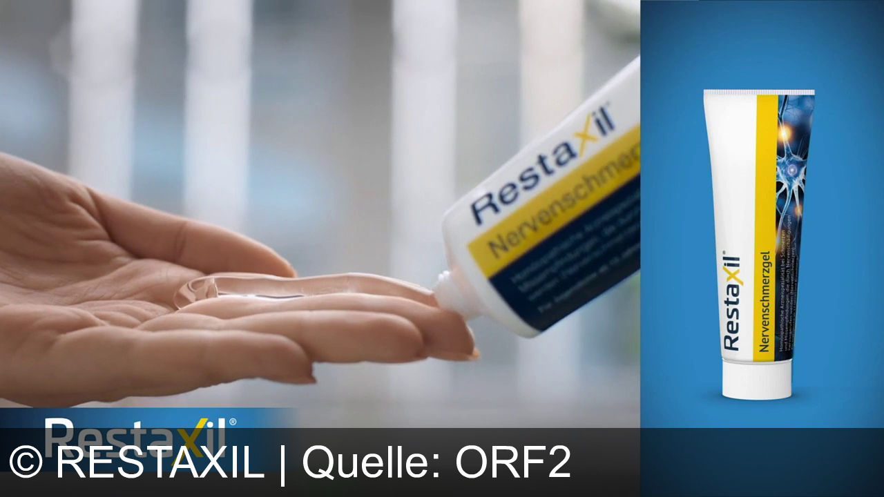 Eine Hand hält ein Gel, das aus einer Tube gedrückt wird. Auf der Tube steht "Nervenschmerzgel." Rechts ist ein Bild der Tube vor blauem Hintergrund. Unten links steht "Restaxil".