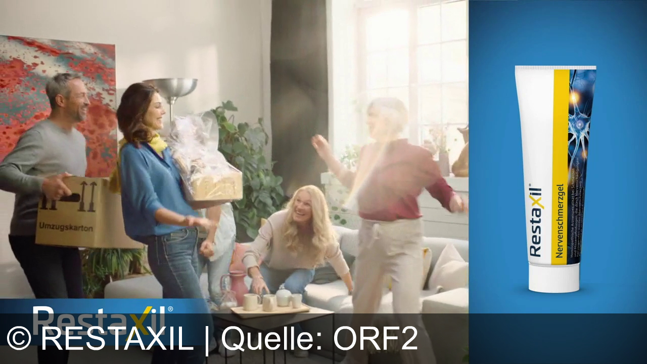Mehrere Personen in einem Wohnzimmer, einige lachen und tanzen. Eine Frau hält einen Geschenkkorb, ein Mann trägt einen Umzugskarton. Eine andere Frau sitzt und lacht. Rechts im Bild ist eine Tube mit der Aufschrift "Restaxil Nervenschmerzgel" zu sehen. Eine Teekanne und Tassen stehen auf einem kleinen Tisch. Ein großes, farbenfrohes Bild hängt an der Wand.