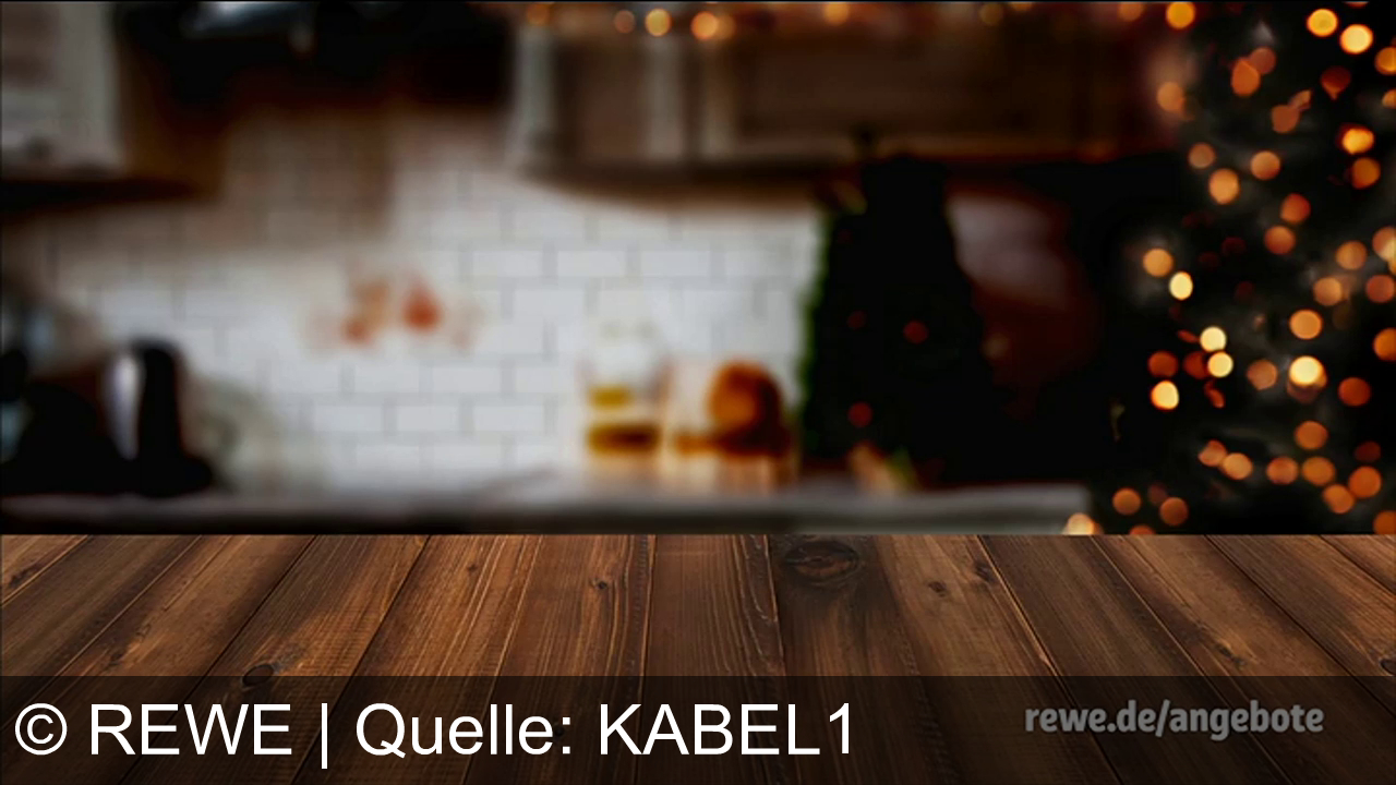 Ein unscharfer Hintergrund mit einer Küche und einem Weihnachtsbaum. Im Vordergrund ein Holztisch. Unten rechts steht “rewe.de/angebote”. Stimmungsvoll beleuchtet.