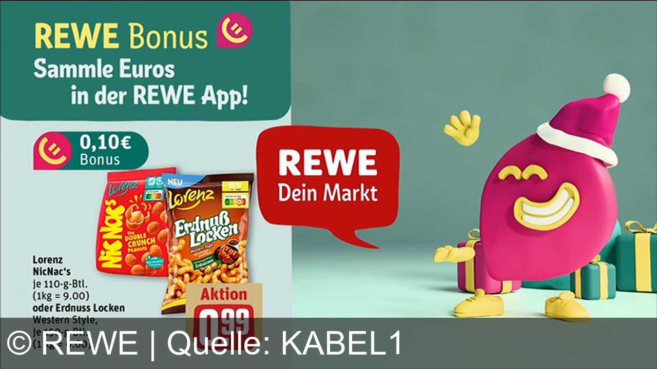 REWE Bonus Werbung. Links Bild von Lorenz NicNac's und Erdnuss Locken für 0,99 € im Angebot, dazu 0,10 € Bonus. Rechts fröhliches, pinkes Maskottchen mit Weihnachtsmütze, hält rote Sprechblase "REWE Dein Markt". Hintergrund türkis, daneben Geschenke. Sammle Euros in der REWE App.