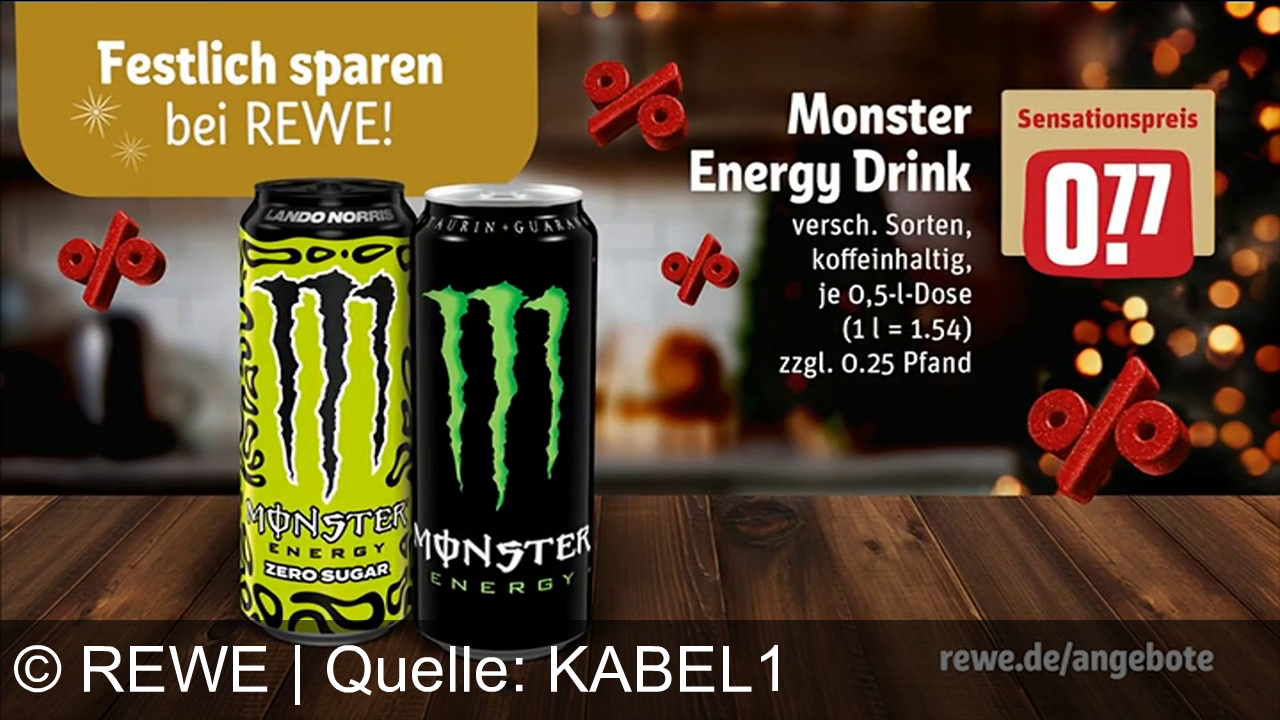 Monster Energy Drinks, zwei Dosen auf Holzuntergrund. Links eine gelb-schwarze Zero Sugar Dose mit "Lando Norris" beschriftet. Rechts eine klassische schwarze Dose. Oben ein Banner mit "Festlich sparen bei REWE!". Rechts der Sensationspreis 0,77 Euro, inklusive Pfand. Hintergrund mit unscharfen Lichtern, weihnachtlich. Prozentsymbole dekorativ.