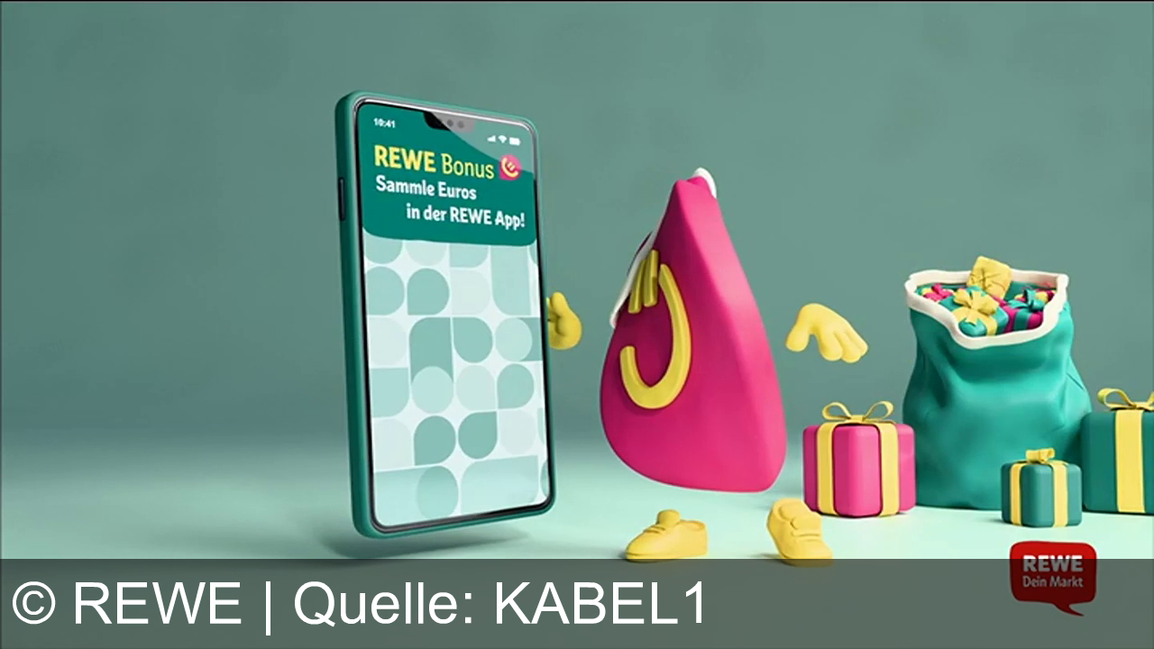 Ein pinkes, tropfenförmiges Wesen mit gelben Details steht neben einem großen Smartphone. Auf dem Display steht "REWE Bonus Sammle Euros in der REWE App!". Rechts sind Geschenke und ein gefüllter Sack. Unten rechts das Logo "REWE Dein Markt".