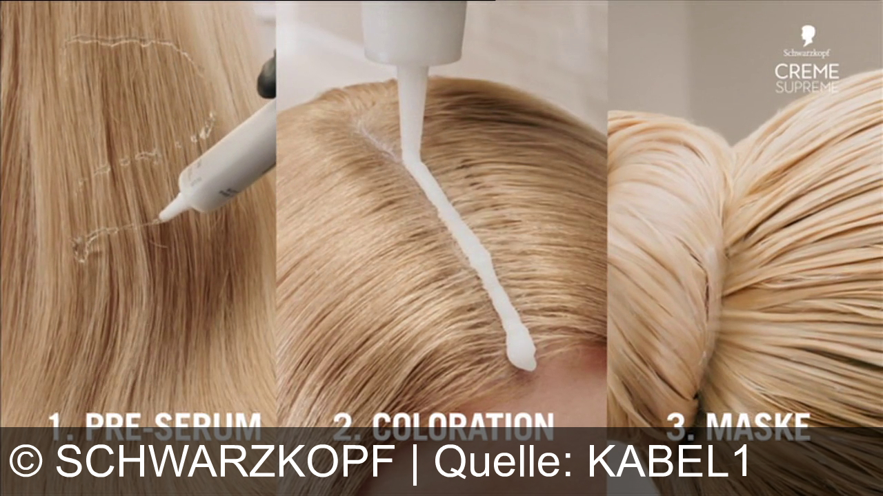 Dreigeteilte Abbildung: Links wird ein Pre-Serum auf blondes Haar aufgetragen, in der Mitte erfolgt die Haarcoloration, rechts ist eine Haarmaske aufgetragen. Oben rechts das Logo von Schwarzkopf Creme Supreme. Unten sind die Schritte nummeriert: 1. Pre-Serum, 2. Coloration, 3. Maske.