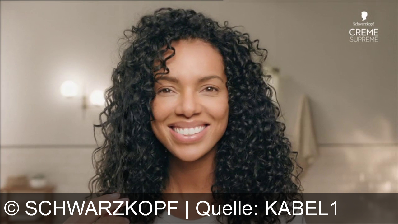 Eine Frau mit lockigem Haar lächelt in die Kamera. Im Hintergrund sind ein helles Zimmer und verschwommene Objekte zu sehen. Oben rechts steht "Schwarzkopf CREME SUPREME".