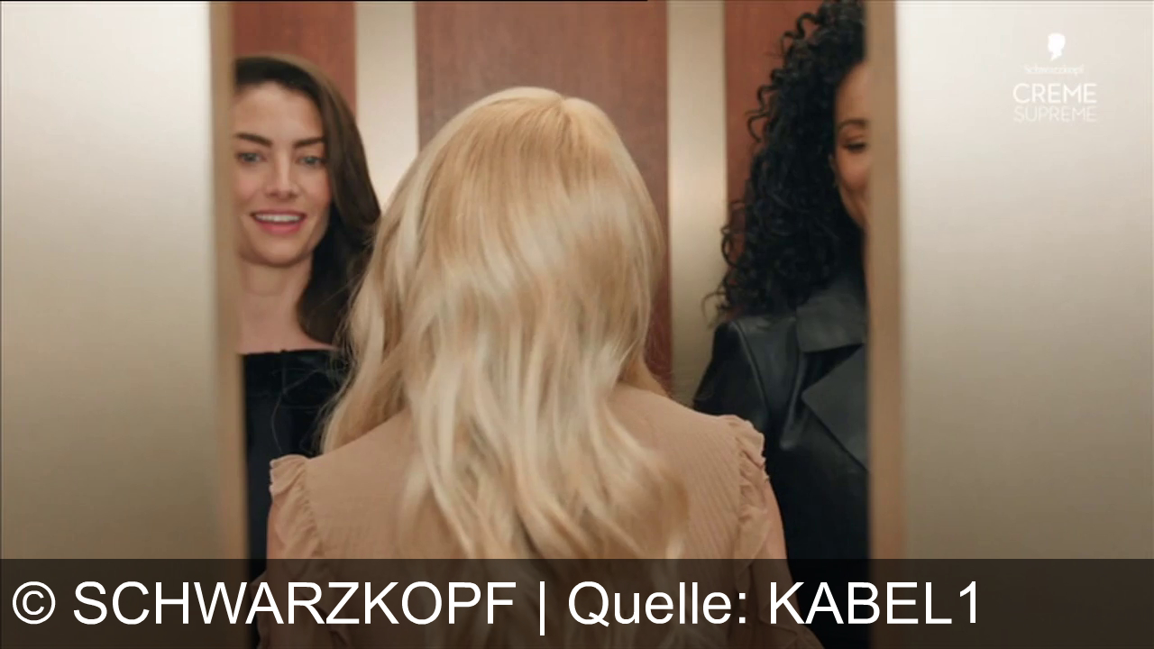 Drei Frauen stehen in einem Aufzug. Die Frau in der Mitte hat blonde Haare und trägt ein beiges Oberteil. Die andere Frau links hat langes, dunkles Haar und lächelt. Rechts steht eine Frau mit lockigem Haar und trägt eine dunkle Jacke. Oben rechts steht "Schwarzkopf Creme Supreme".