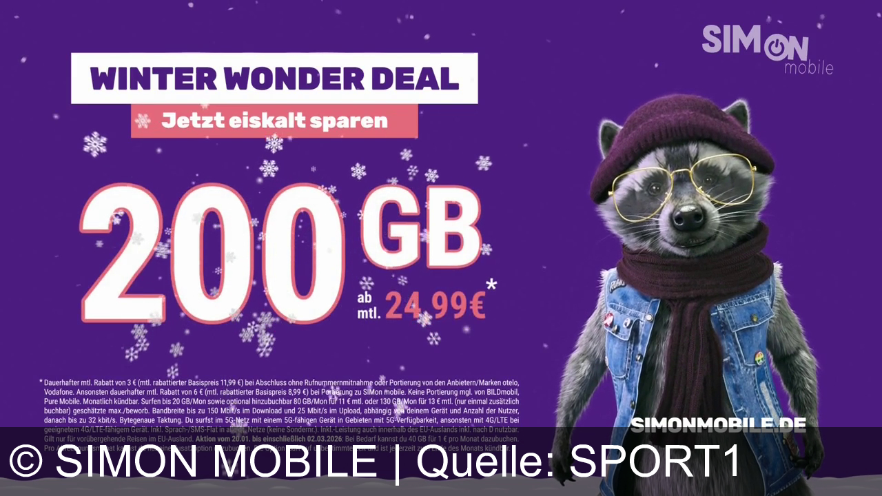 Werbung aus dem Jahr 2026 von Simon Mobile in Österreich, mit dem von uns gewählten Titel: "Eiskalt sparen mit SIMON mobile: 200 GB Winter Wonder Deal für nur 24,99 €" mit der Kurzbeschreibung: "Winter Wonder Deal bei SIMON mobile: 200 GB ab 24,99€ mtl. Jetzt eiskalt sparen auf simonmobile.de!". Diese Werbung thematisiert oder beinhaltet die Kategorien Mobilfunkvertrag.