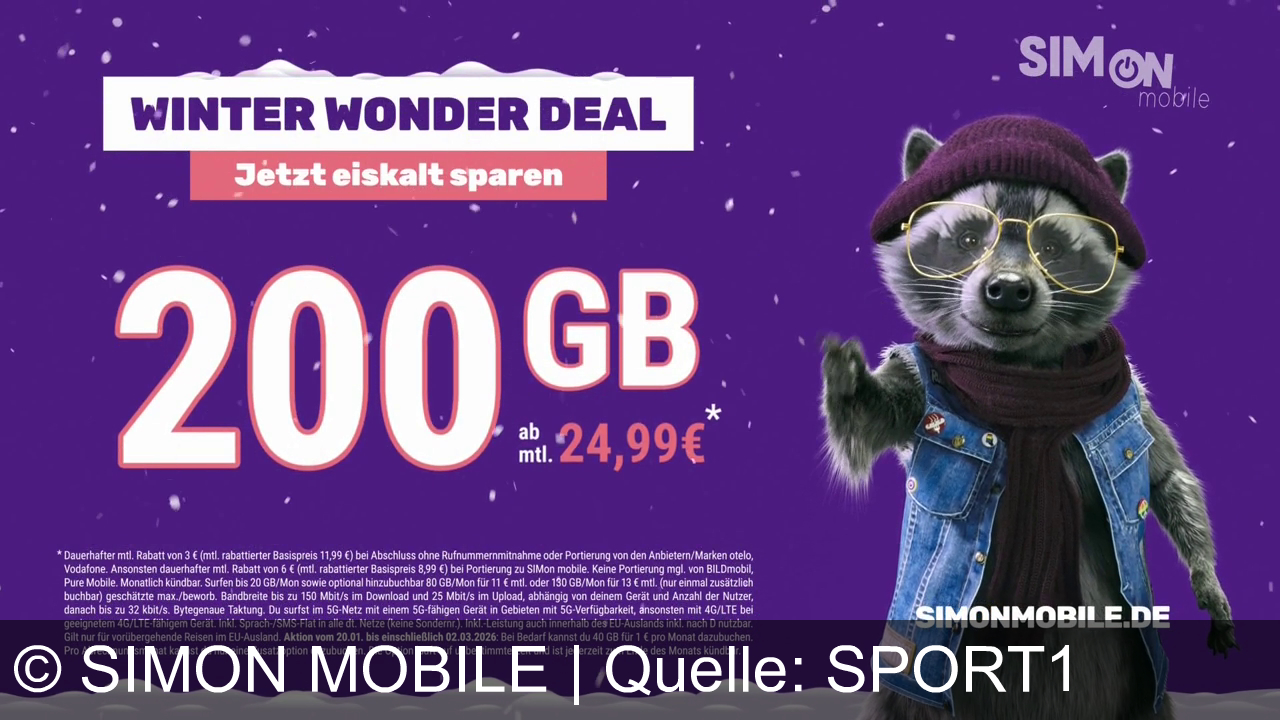 SIMON mobile bewirbt den Winter Wonder Deal: Ein Mobilfunktarif mit 200 GB für 24,99 Euro im Monat. Die zentrale Botschaft ist günstiges, „eiskaltes“ Sparen beim Datenvolumen, beworben durch den animierten Waschbären.