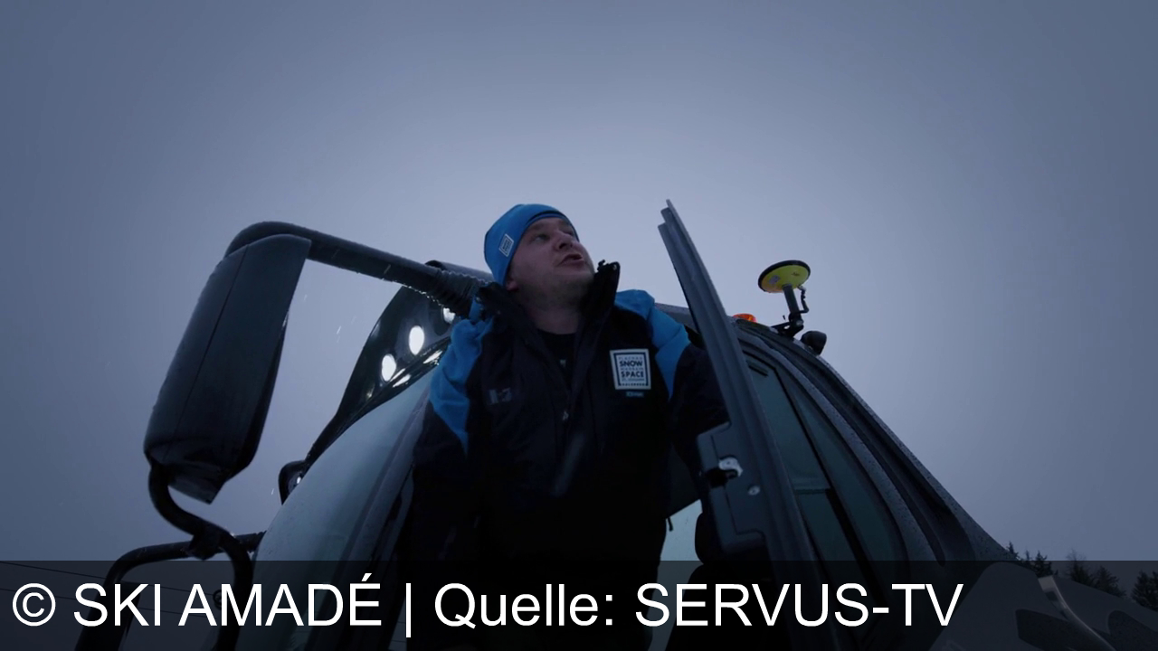 Ein Mann trägt eine blaue Mütze und Jacke mit der Aufschrift "Snow Space". Er steht in einer geöffneten Tür eines Fahrzeugs, umgeben von Scheinwerfern. Der Himmel ist grau. Im Hintergrund sind Bäume erkennbar.