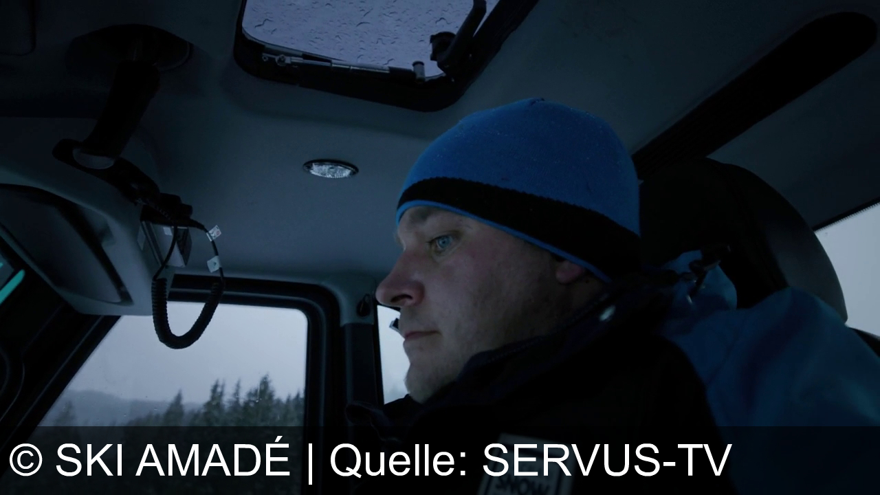 Ein Mann mit blauer Mütze sitzt in einem Fahrzeug. Das Dachfenster ist offen, das Wetter draußen scheint winterlich. Im Hintergrund sind Bäume und schneebedeckte Hügel zu sehen. An der Decke des Fahrzeugs hängt ein Mikrofon. Auf der Jacke steht "Flachau Snow". Die Szene spielt sich offenbar in einer kalten Umgebung ab.