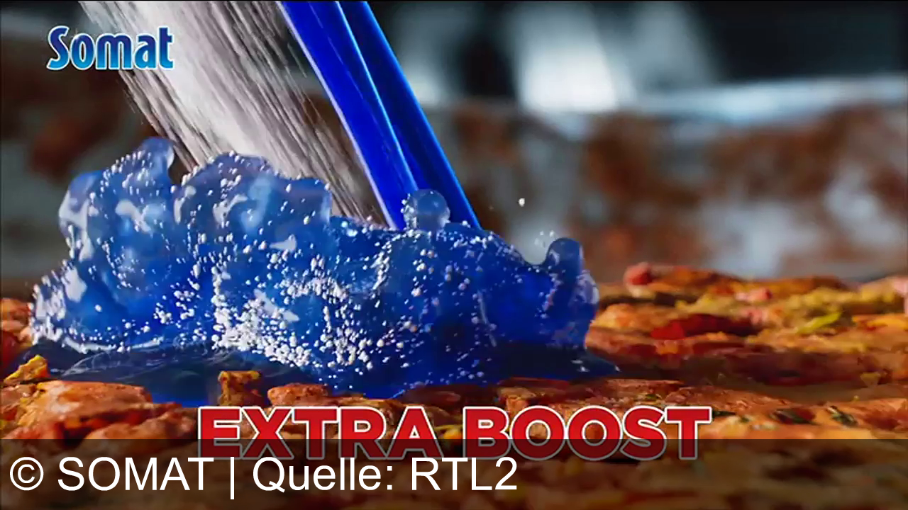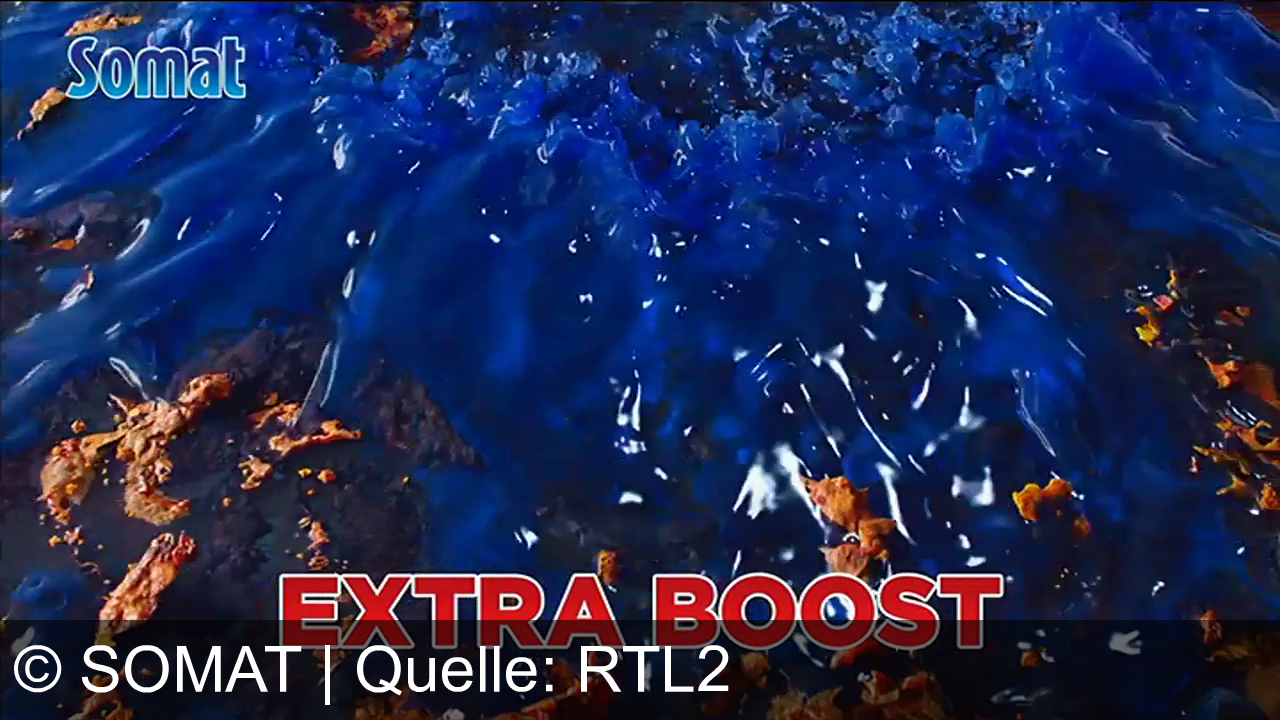 Blaues flüssiges Material fließt über eine Oberfläche mit orangefarbenen Partikeln. Oben links steht "Somat" in blauer Schrift. Unten groß und rot der Text "EXTRA BOOST".