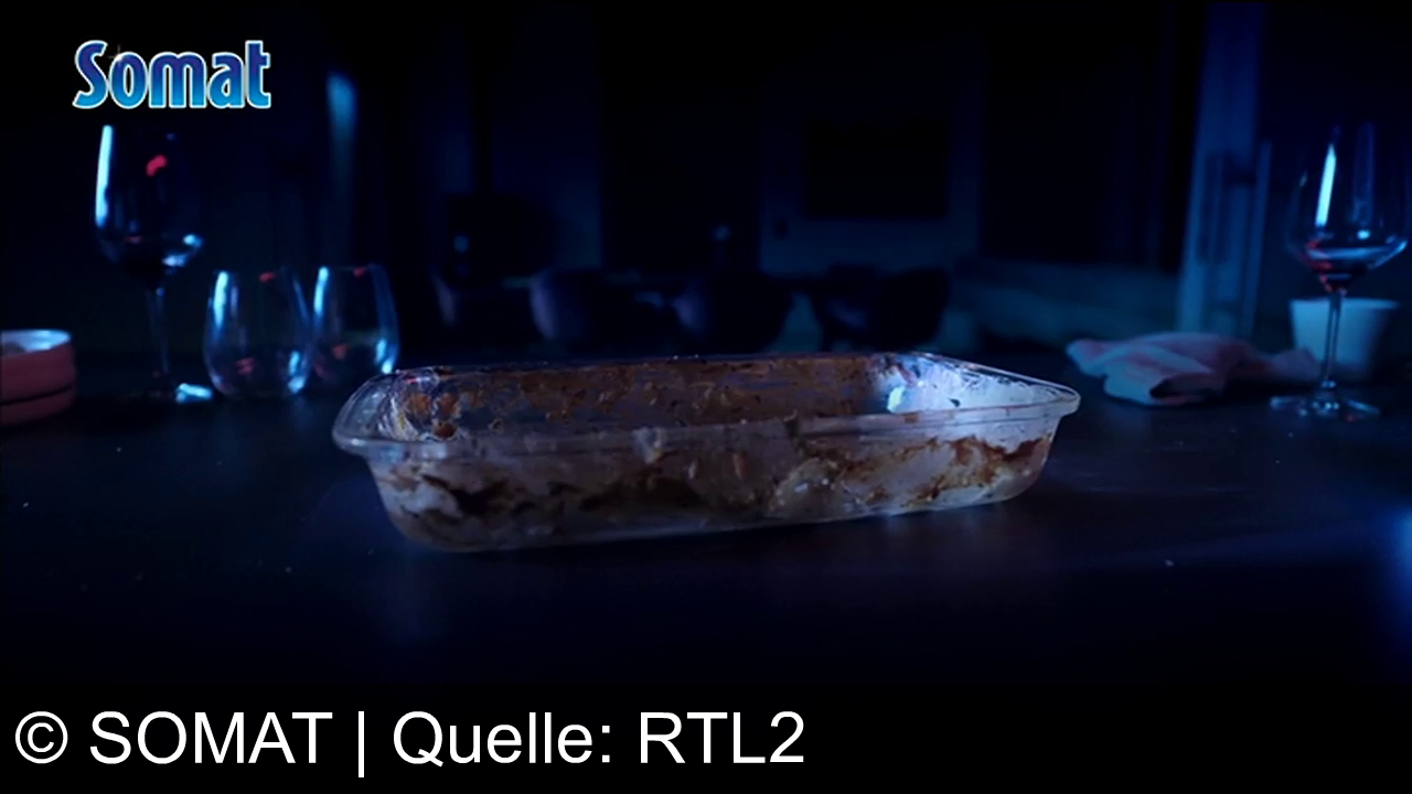 Ein halbvoller Auflaufform auf einem Tisch, daneben mehrere Weingläser, teilweise leer, und ein Handtuch. Oben links steht "Somat". Die Szene ist in blaues Licht getaucht. Im Hintergrund unscharfe Stühle.