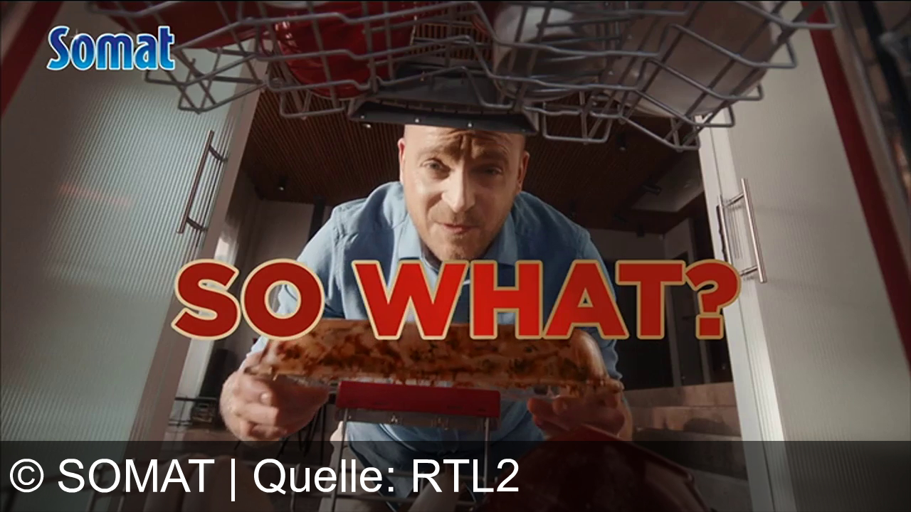Ein Mann in blauem Hemd blickt in eine offene Spülmaschine. Er hält ein Stück Pizza. Oben links steht "Somat". Über dem Mann steht in großen roten Buchstaben "SO WHAT?".