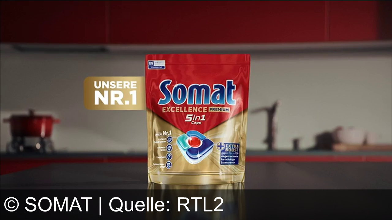 Eine Packung Somat Spülmaschinentabs steht im Vordergrund auf einer schwarzen Fläche. Links daneben ein Schriftzug "UNSERE NR.1". Im Hintergrund ist eine rote Küchenszene mit Topf und unscharfen Gegenständen erkennbar.