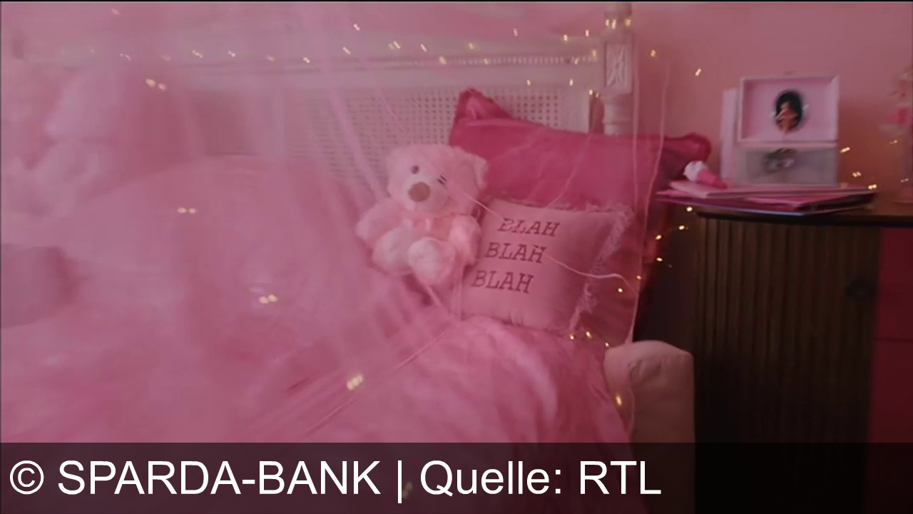 Ein pinkes Bett steht unter einem rosa Netz, dazu passen Kissen und eine Decke in Pink. Ein Stoffteddy lehnt an einem Kissen mit dem Aufdruck BLAH BLAH BLAH. Auf dem Nachttisch liegen ein paar pinke Sachen und eine kleine Schmuck- oder Spieluhr. Lichterketten funkeln im Raum.