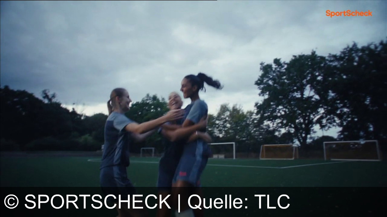 Drei Frauen in Sportkleidung umarmen sich freudig auf einem Fußballplatz. Im Hintergrund sind zwei leere Tore und Bäume. Der Himmel ist bewölkt. Oben rechts ist das Logo von SportScheck zu sehen.