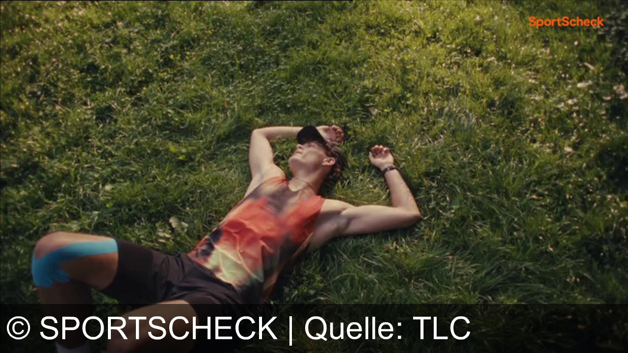 Ein Mann liegt im Gras mit einem bunten Tanktop und einer schwarzen Kappe. Er trägt kurze Sporthosen und hat blaue Kinesio-Tapes am Bein. Die Arme sind nach oben ausgestreckt, Augen geschlossen. Rechts oben steht "SportScheck" in orangefarbener Schrift. Die Szene ist in einer grünen Wiese bei Tageslicht.
