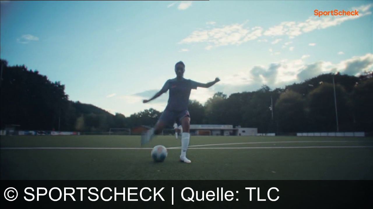 Auf einem Fußballfeld schießt eine Person den Ball in Bewegung. Sie trägt Sportkleidung in dunklen Farben und weiße Stutzen. Im Hintergrund sind Bäume und ein Gebäude zu sehen, der Himmel ist leicht bewölkt. Oben rechts steht "SportScheck".