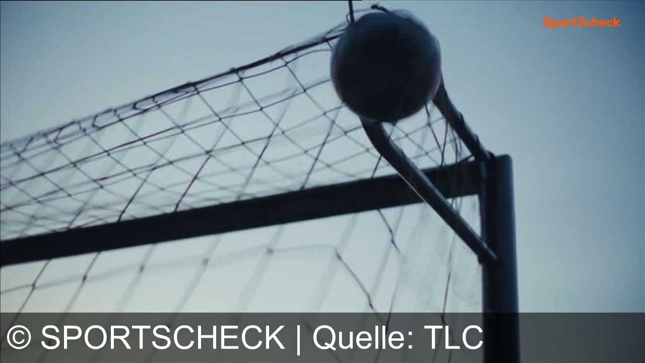 Ein Fußball fliegt in ein Tor, das Netz wölbt sich. Oben links steht „SportScheck“ in orange geschrieben. Himmel im Hintergrund.