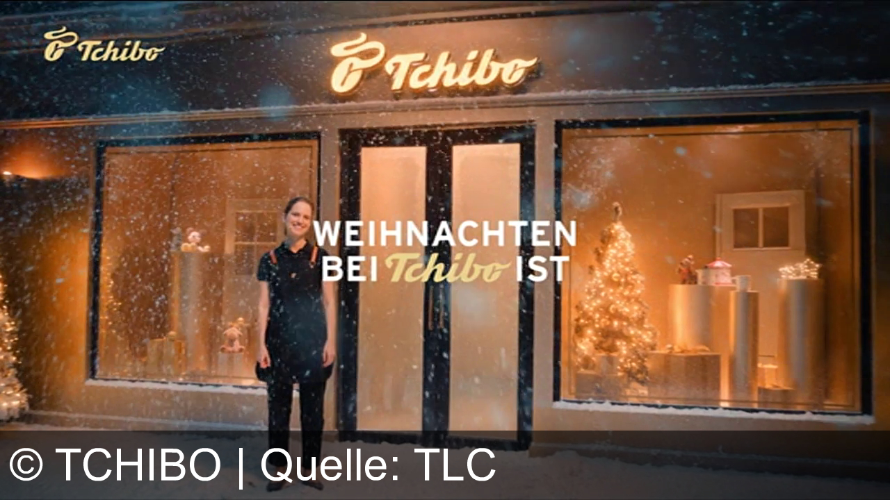 Eine Frau steht vor einem Tchibo-Geschäft. Im Schaufenster leuchtet ein beleuchteter Weihnachtsbaum. Schnee fällt vor dem Geschäft. Über der Frau steht der Text "WEIHNACHTEN BEI TCHIBO IST".
