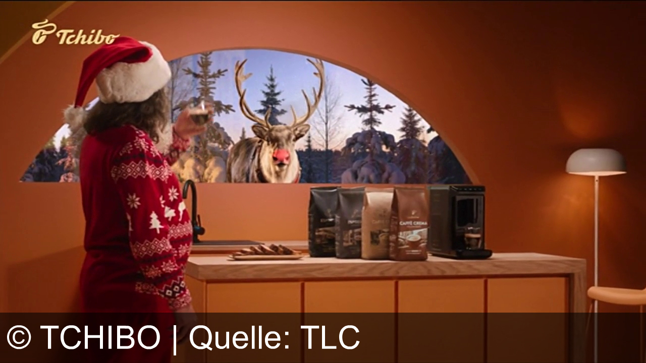 Ein Mann in einem roten Weihnachtsoutfit und Weihnachtsmütze steht in einer orangefarbenen Küche vor einem Fenster. Draußen ist ein Rentier mit leuchtend roter Nase. Auf der Theke stehen Kaffeepackungen von Tchibo und eine Kaffeemaschine. Rechts eine weiße Stehlampe, links oben das Tchibo-Logo.