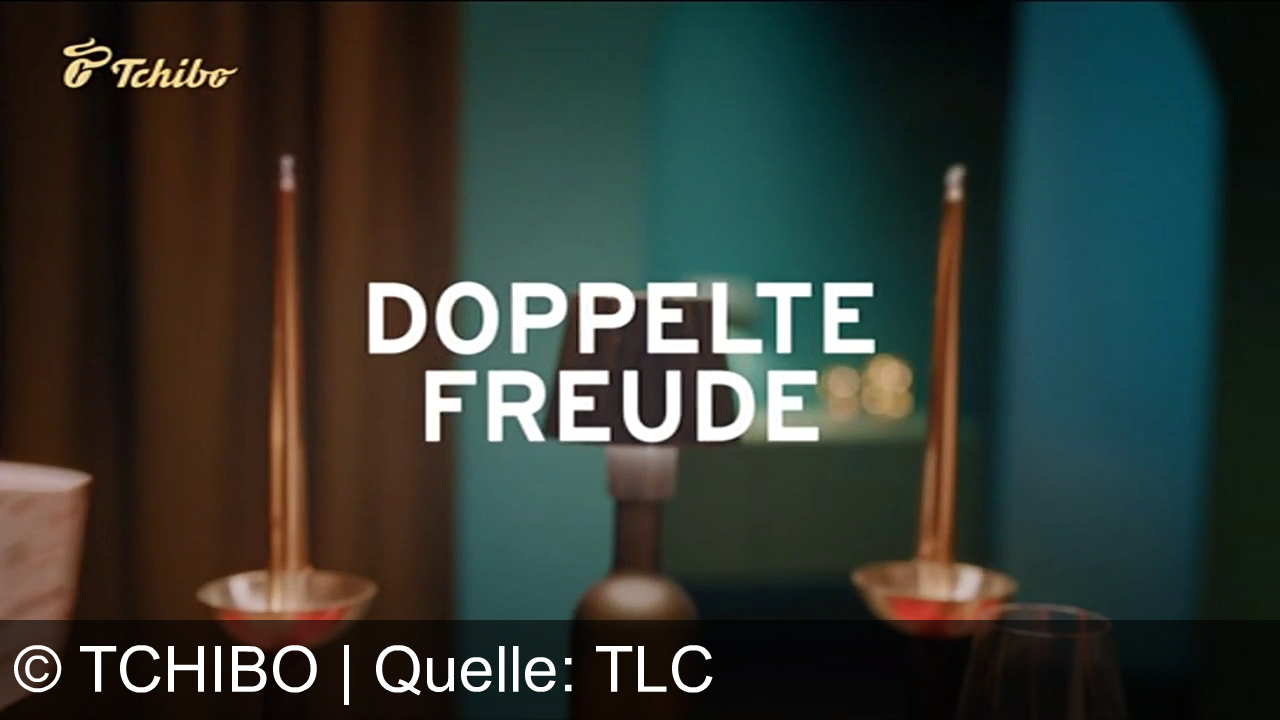 Zwei Räucherstäbchen in Haltern links und rechts, im Hintergrund eine Lampe mit weißem Schirm. Der Text "DOPPELTE FREUDE" steht im Vordergrund. Links oben das Tchibo-Logo. Dezentes Licht mit warmen Farben.