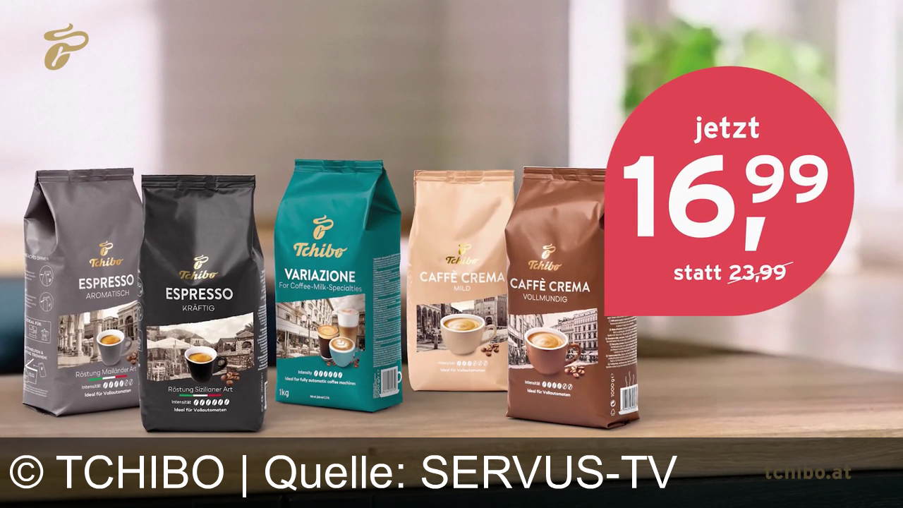 Werbung aus dem Jahr 2025 von Tchibo in Österreich, mit dem von uns gewählten Titel: "Tchibo: Hochwertige Espresso- und Crema-Kaffees zum Angebotspreis von 16,99 € entdecken" mit der Kurzbeschreibung: "Erlebe das Lächeln von Tchibo in Österreich: Genieße Espresso und Crema ab 16,99 €. Entdecke wirklich Gutes – in jeder Tasse, in unseren Filialen und bei tchibo.at!". Diese Werbung thematisiert oder beinhaltet die Kategorien Kaffee, Tasse.