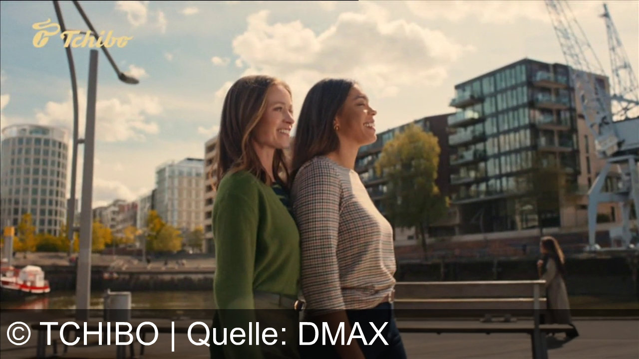 Zwei Frauen laufen an einer Uferpromenade entlang. Im Hintergrund sind moderne Gebäude und ein Wasserarm zu sehen. Ein Kran und einige Bäume runden die urbane Szenerie ab. Beide Frauen lächeln und scheinen einen entspannten Spaziergang zu genießen. Der Himmel ist bewölkt, jedoch scheint die Sonne durch die Wolken. Das Logo von Tchibo ist oben links eingeblendet.