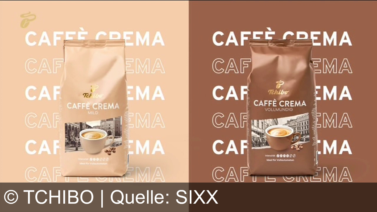 Links und rechts stehen zwei Kaffeepackungen von Tchibo. Die linke Packung ist hell und zeigt "Caffè Crema Mild", die rechte ist dunkler mit "Caffè Crema Vollmundig". Im Hintergrund wiederholt sich der Schriftzug "CAFFÈ CREMA".