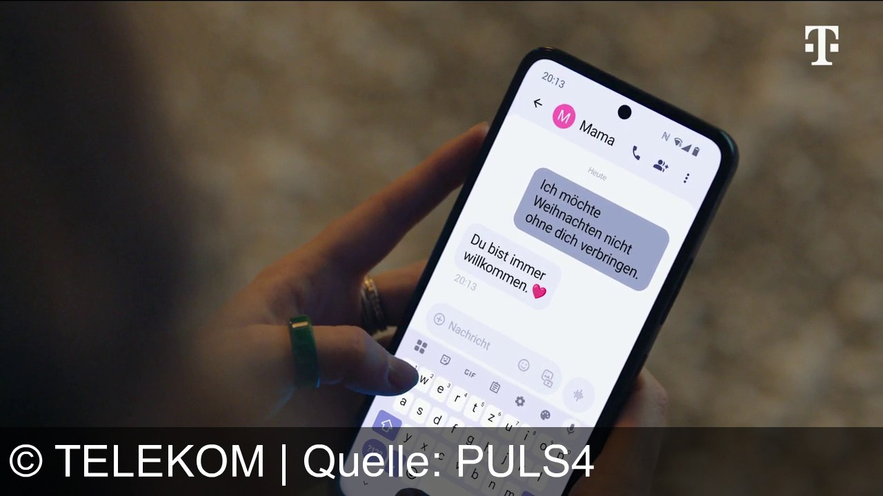 Eine Hand hält ein Smartphone. Auf dem Bildschirm ist ein Chat mit „Mama“ zu sehen. Die Nachrichten lauten: „Ich möchte Weihnachten nicht ohne dich verbringen.“ und „Du bist immer willkommen.“ Ein Herz-Emoji ist dabei. Oben rechts befindet sich ein Telekom-Logo.