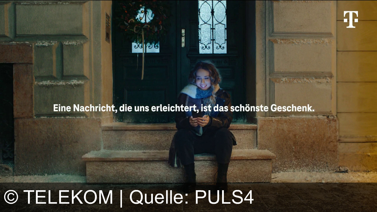 Eine Person sitzt lächelnd auf den Treppenstufen eines Hauses, umgeben von winterlichem Ambiente. Sie hält ein Smartphone in den Händen. Oben rechts ist ein Telekom-Logo, in der Mitte steht: "Eine Nachricht, die uns erleichtert, ist das schönste Geschenk." Die Haustür ist mit einem Weihnachtskranz dekoriert.