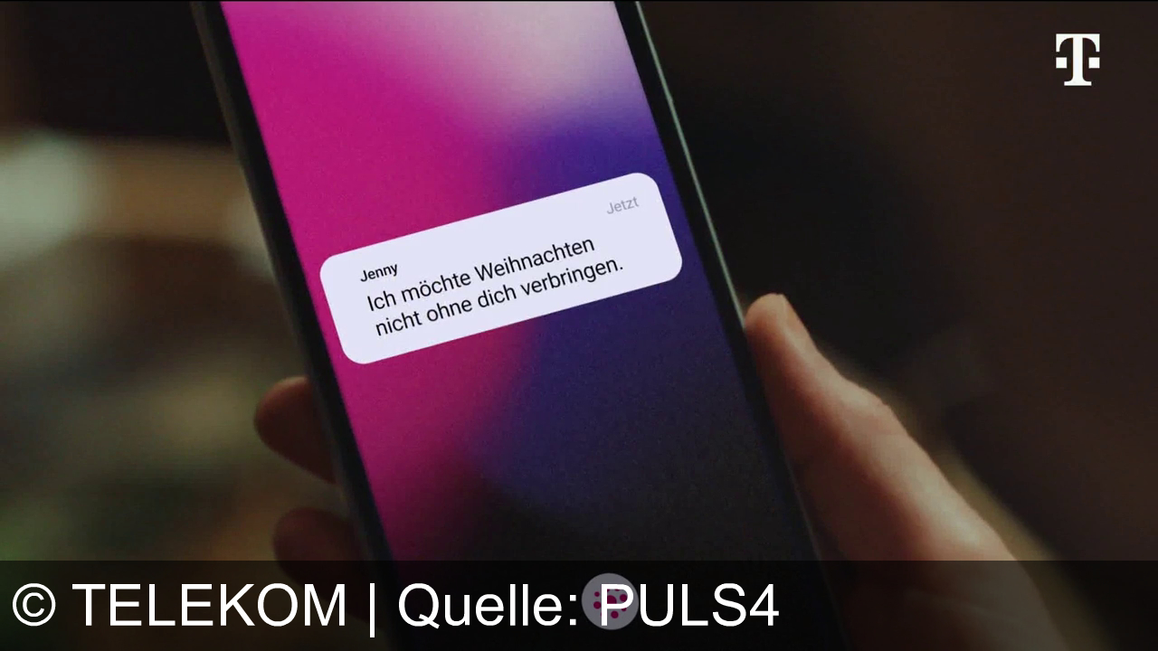 Eine Hand hält ein Smartphone. Auf dem Display erscheint eine Nachricht von "Jenny". Der Text der Nachricht lautet: "Ich möchte Weihnachten nicht ohne dich verbringen." Oben rechts ist ein Logo mit einem "T". Der Hintergrund des Bildschirms hat einen Farbverlauf von Rosa zu Lila.