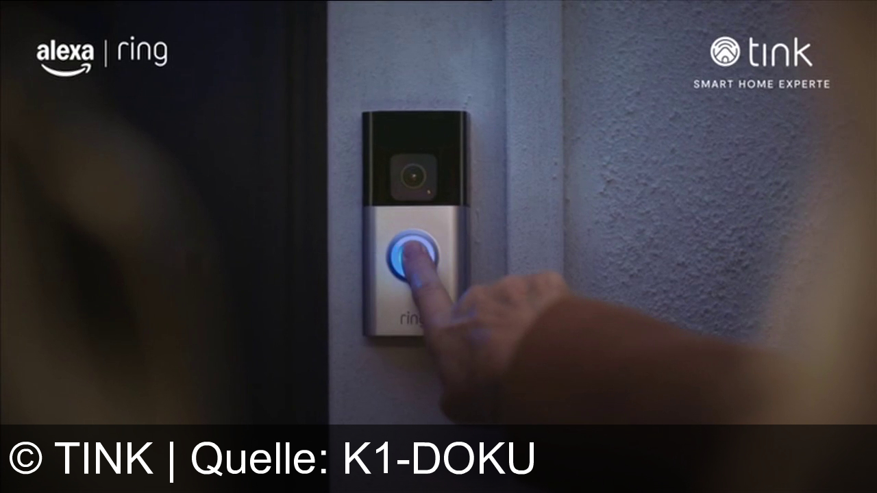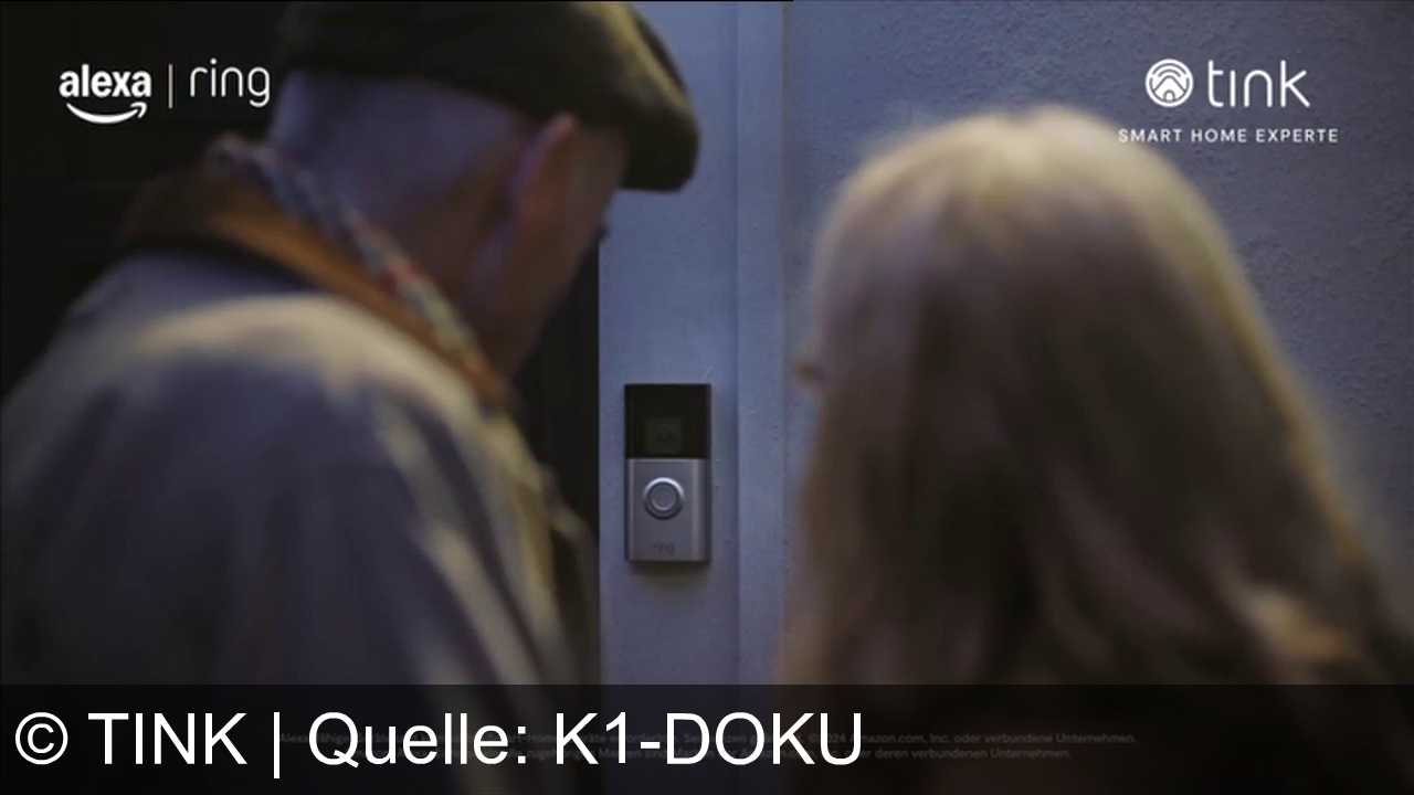 Zwei Personen stehen vor einer Tür, fokussiert auf eine Video-Türklingel von Ring. Oben links steht "alexa | ring", oben rechts "tink SMART HOME EXPERTE". Die Personen sind von hinten zu sehen, ohne erkennbare Details. Unten ist Text, der schwer lesbar ist. Die Szene wirkt beleuchtet, die Wand ist grau.