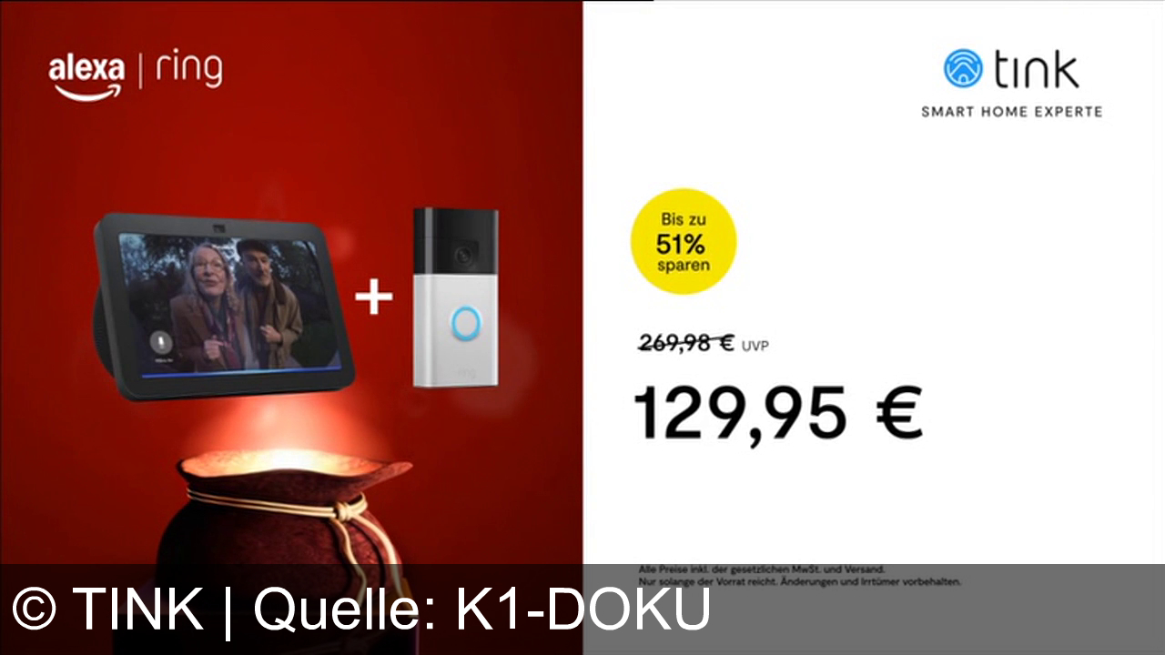 Werbung aus dem Jahr 2025 von Tink in Österreich, mit dem von uns gewählten Titel: "Smarte Sicherheit mit Tink: Amazon Alexa und Ring-Video-Türklingel im Bundle zum Vorteilspreis" mit der Kurzbeschreibung: "Steuere dein Zuhause smart mit Tink, Alexa & Ring! Sichere dir das Weihnachts-Duo für nur 129,95 € und spare bis zu 51 %. Jetzt auf tink.de – dein Smart-Home-Experte!". Diese Werbung thematisiert oder beinhaltet die Kategorien Tablet, Elektronik, Lautsprecher.