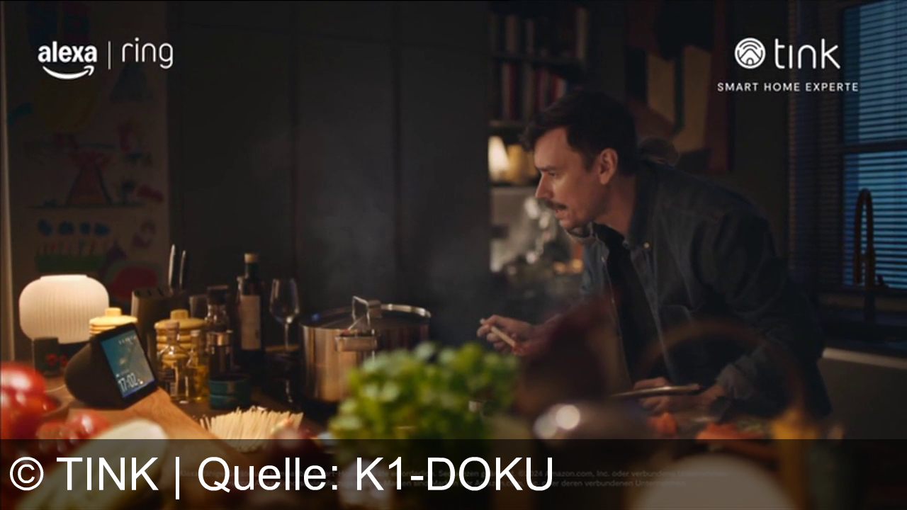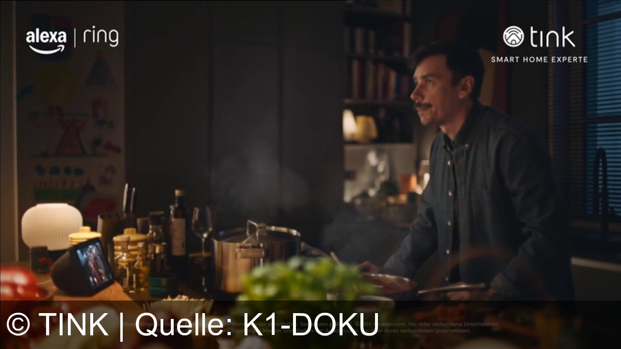 Ein Mann steht in einer Küche und schaut auf einen Topf. Es gibt Gemüse, Ölflaschen und ein smartes Gerät auf der Arbeitsplatte. Oben links stehen Logos von Alexa und Ring, oben rechts das Logo von tink mit der Beschreibung "Smart Home Experte". Im Hintergrund sind Regale mit Büchern und Deko.