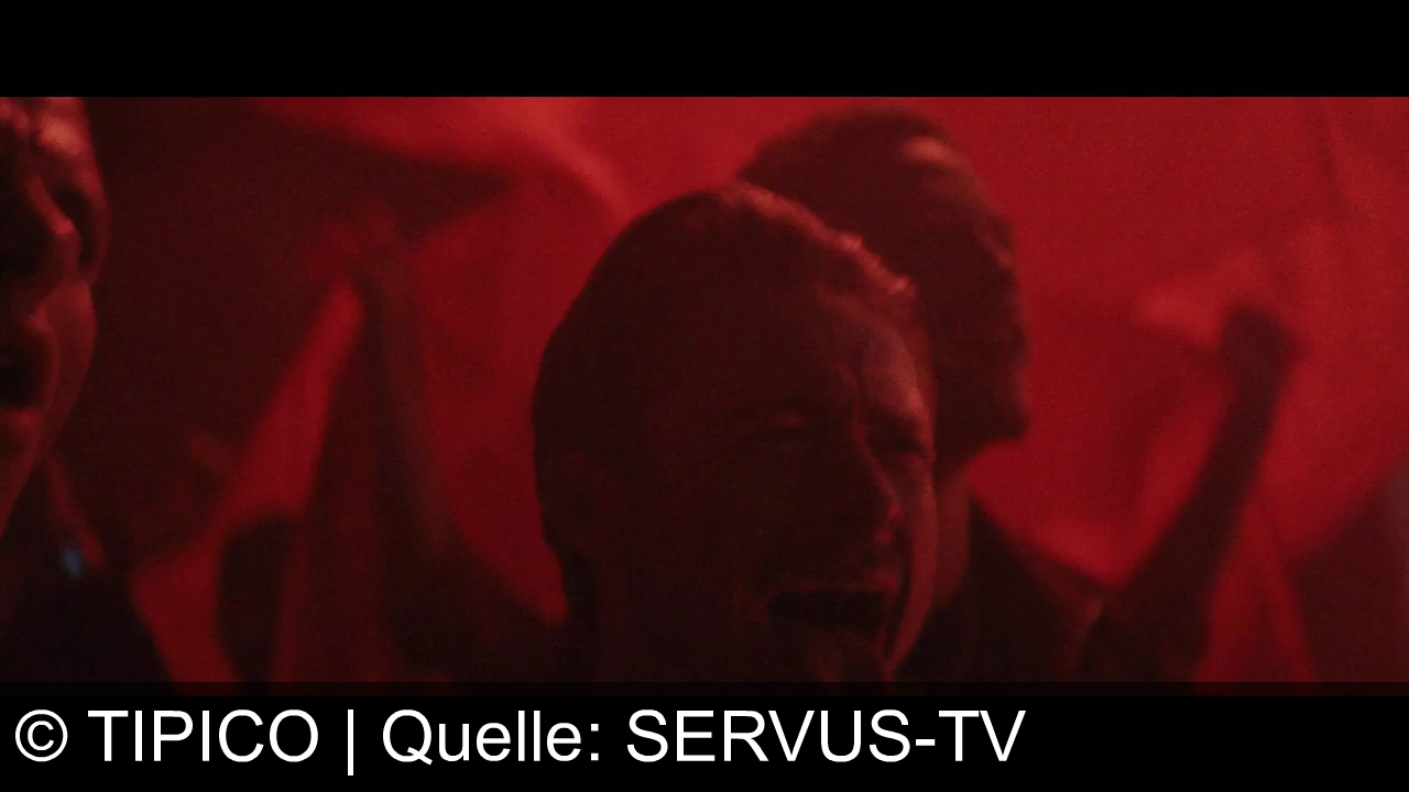 Im roten Licht sind mehrere Personen erkennbar. Im Vordergrund steht ein Mann mit kurzen Haaren und Ohrring. Weitere Personen stehen verschwommen im Hintergrund. Eine rote Fahne ist hinter ihnen. Die Szene wirkt atmosphärisch und intensiv beleuchtet.