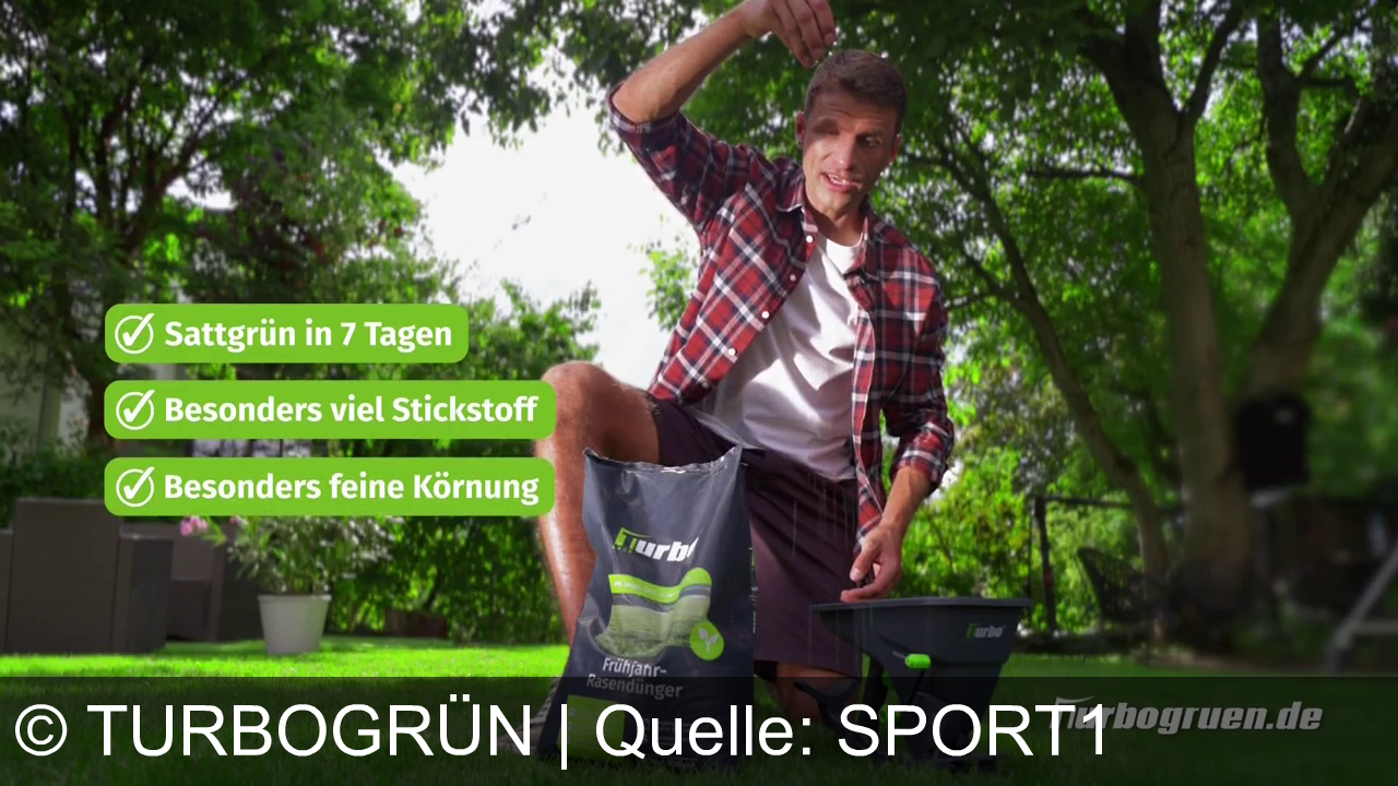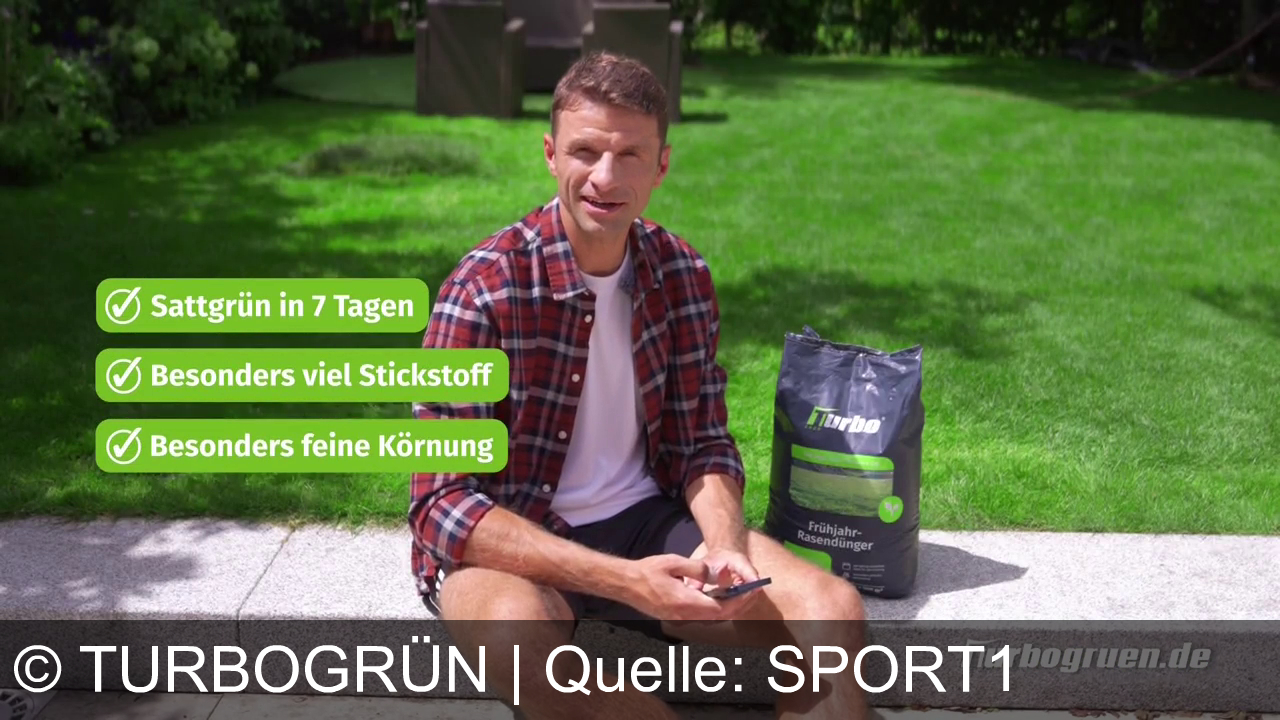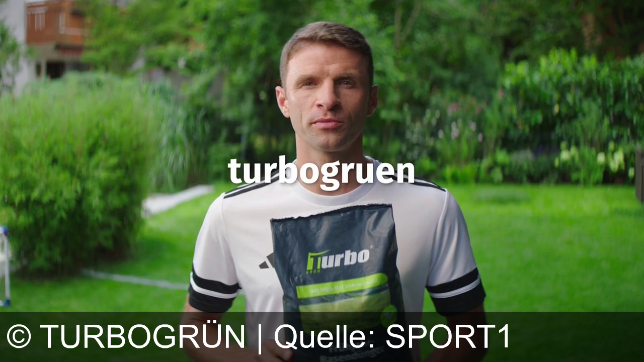 Turbogrün Werbung aus dem Jahr 2026 in Österreich, mit dem von uns gewählten Titel: "Thomas Müllers Geheimnis: Turbogrün Rasendünger für sattes Grün in 7 Tagen" mit der Kurzbeschreibung: "Fußballstar Thomas Müller wirbt für Turbo-Grün: Dünger-Doping für sattgrünen Rasen in nur 7 Tagen. Jetzt auf turbogruen.de bestellen! "Doping für den Rasen. Mit Turbo-Grün-Dünger. In sieben Tagen satt grüner Rasen. Da ist so viel Stickstoff drin, der gibt dem Rasen die nötige Energie. Und wenn man die Feinkörnigkeit anschaut, dann weiß man auch, wieso es so schnell wirkt. Kleine Körnung, schnelle Wirkung. Ihr habt mir unzählige Vorher-Nachher-Bilder geschickt. Die Rasen sehen echt super aus. Turbo-Grün liefert direkt vor die Haustür. Geh jetzt auf turbogrün.de und hol dir deinen Dünger."". Diese Werbung thematisiert oder beinhaltet die Kategorie/n Garten, Onlineshop, Lieferservice