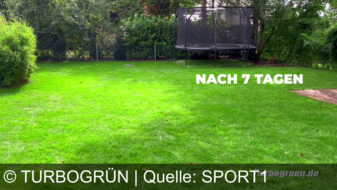 Ein satt grüner Gartenrasen liegt offen vor mir. Hinten steht ein großes Trampolin am Rand der Hecke. Auf der rechten Seite liegt eine braune Abdeckung auf dem Gras. Dazu prangt der Text Nach 7 Tagen.