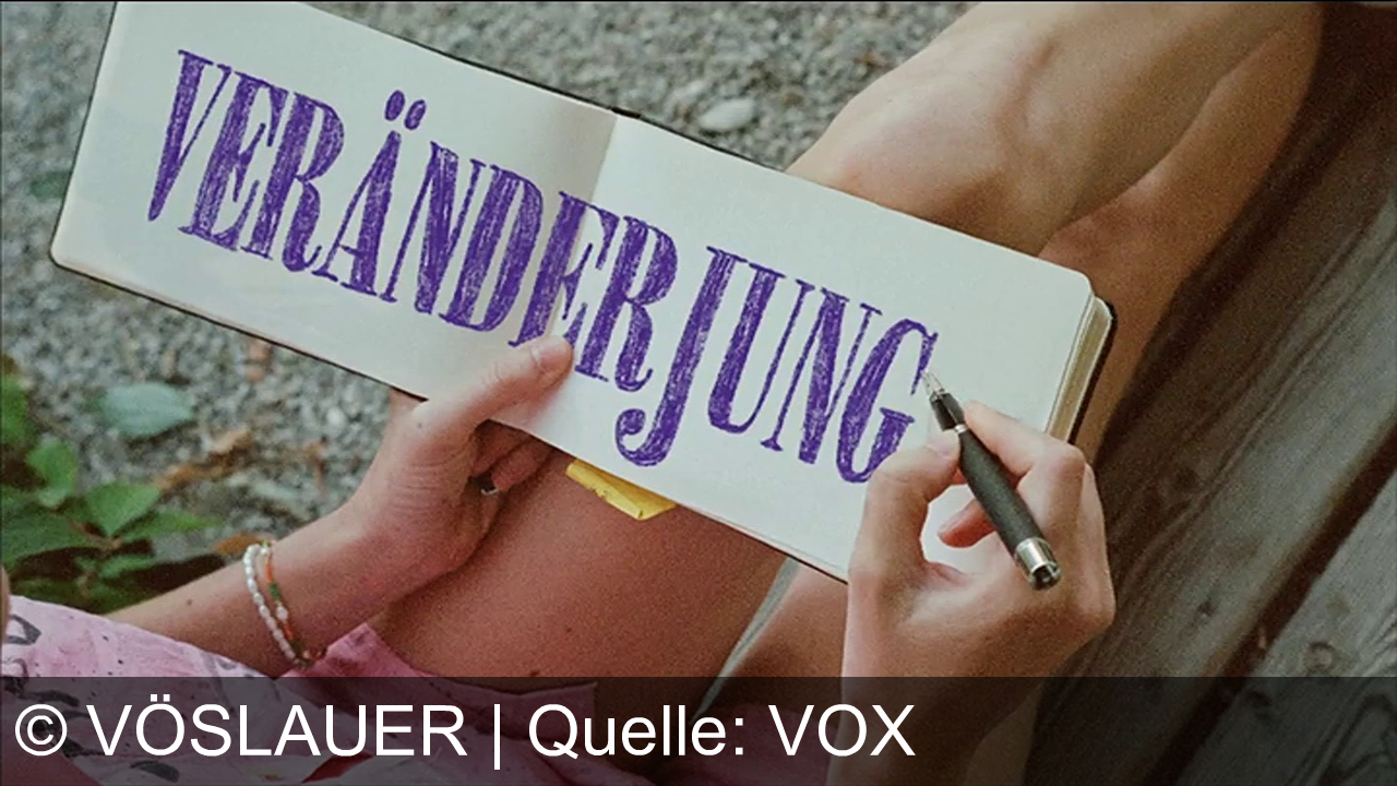 Eine Person sitzt draußen mit überkreuzten Beinen und hält ein offenes Notizbuch auf dem Schoß. Mit einem Stift wird das große lila Wort VERÄNDERJUNG festgehalten. Die Hände tragen bunte Armbänder, der Boden besteht aus Kies und Holz.