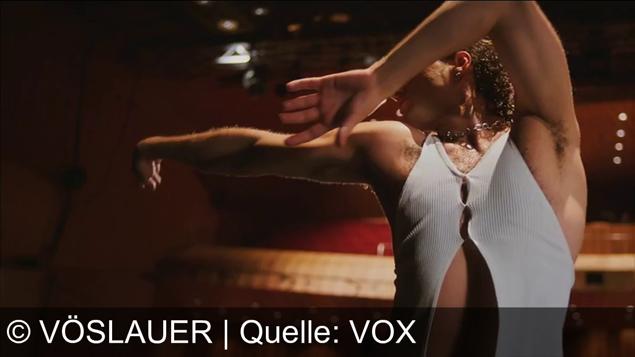 Eine Person tanzt auf einer Bühne, streckt einen Arm weit nach vorn und hält den anderen vor das Gesicht. Das Licht aus dem Zuschauerraum fällt warm auf den Körper. Die Person trägt ein enges, vorne offen geknöpftes Oberteil und bewegt sich kraftvoll und geschmeidig.